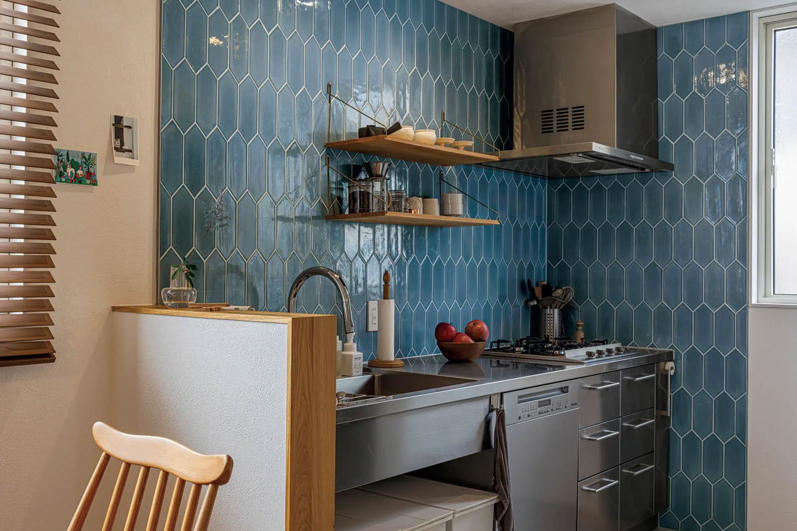 水ハネや手元を隠すための「目隠し壁(立ち上がり)」を設ける場合は、壁の上部の天板(カウンター)を調理器具やお皿の仮置きスペースとして使えます。またこの立ち上がり部分を活用してキッチン側、もしくはダイニング側にスパイスや日用品を置けるニッチを設けることもできます。