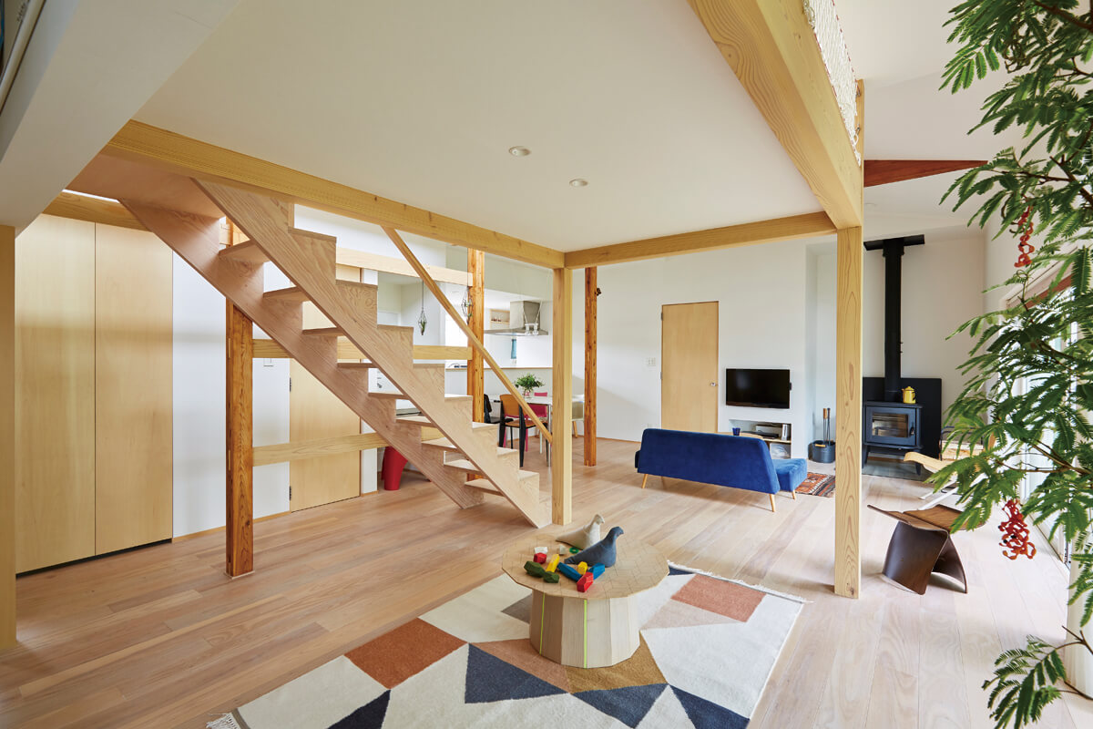 一番の悩みだった冬の寒さ対策には、室内側から新築同様の断熱材を充填し、断熱性能を高めました。ご主人たっての要望で設置した薪ストーブが、家を隅々まで暖めます。「どこにいても家族がつながってる感じがしますね。薪ストーブは寝た後も暖かく、夜中の授乳もストレスがありませんでした」と奥さんも笑顔で話します。