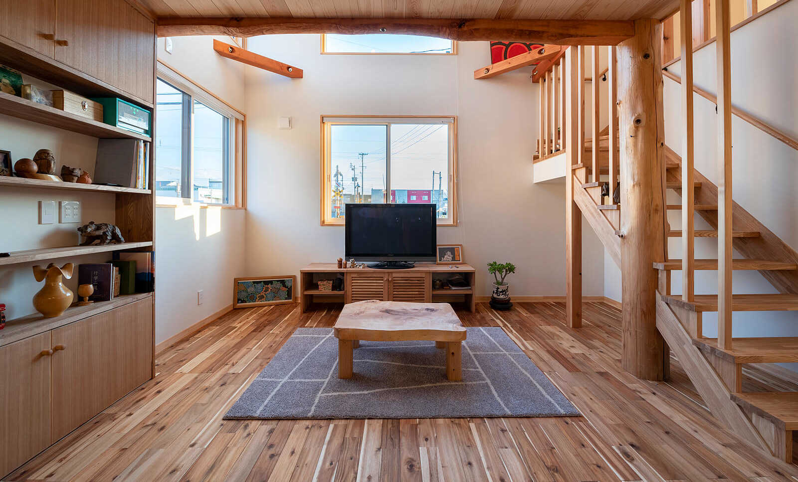 何より素晴らしいのは、その巧みな木づかいです。1階床には温かみのあるアカシアを、2階の床は足触りのいいスギを使い、南部アカマツの梁が支える天井には美しい秋田スギを使用。風格ある振り子時計がかかる大黒柱は見事な青森ヒバです。自社で建具職人も抱えている林工務店では、棚や家具をはじめ建具の一つひとつにいたるまで住まいに合わせた加工を行っています。「毎日食べるご飯と味噌汁のような、変わらない良さを持つ家をつくりたい」。林社長の家づくりへの思いは、熱くストレートです。