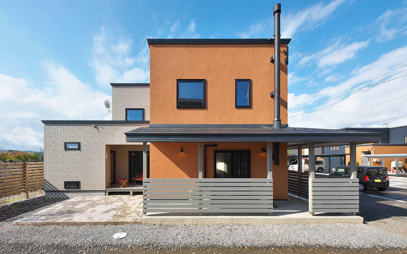 弘前市内の合同展示場「TSUKURIE弘前」に建つ、オレンジ色の外壁と薪ストーブの煙突がひときわ目を惹く、ゴリラデザインのモデルハウス。