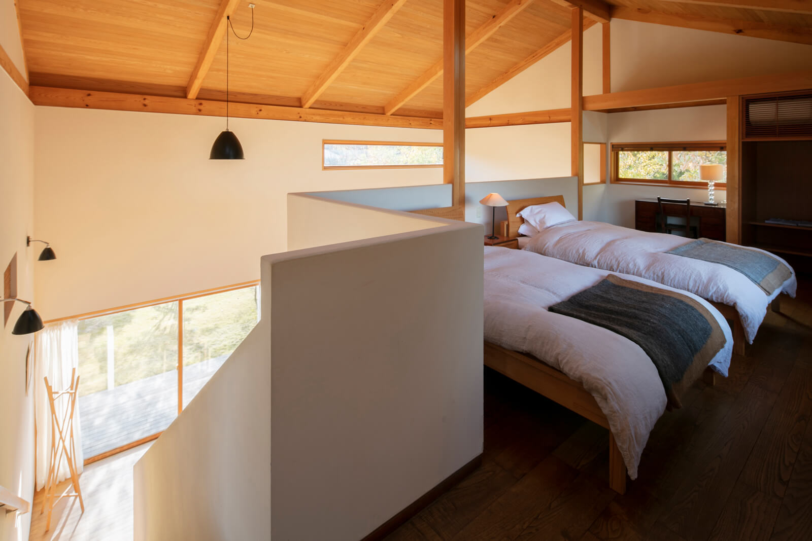 なかでも2階建て一軒家の「スーペリア・スイート」は、「若いカップルが将来家を建てる参考になるように」と設計されたメゾネットタイプ。高い天井と塗り壁が印象的な部屋には、随所に自然素材が使われています。栗の無垢床材は肌触りがやわらかく、天然塗料仕上げで子どもが触れても安心。壁は一面が調湿性のある塗り壁で、室内の空気を快適に保っています。大きく取られた木枠の掃き出し窓からは光が射し込み、どの窓からも緑が見えるので、森に包まれているような感覚を抱きます。木張りの外壁や土壁も周囲の自然との一体感を生み出しています。