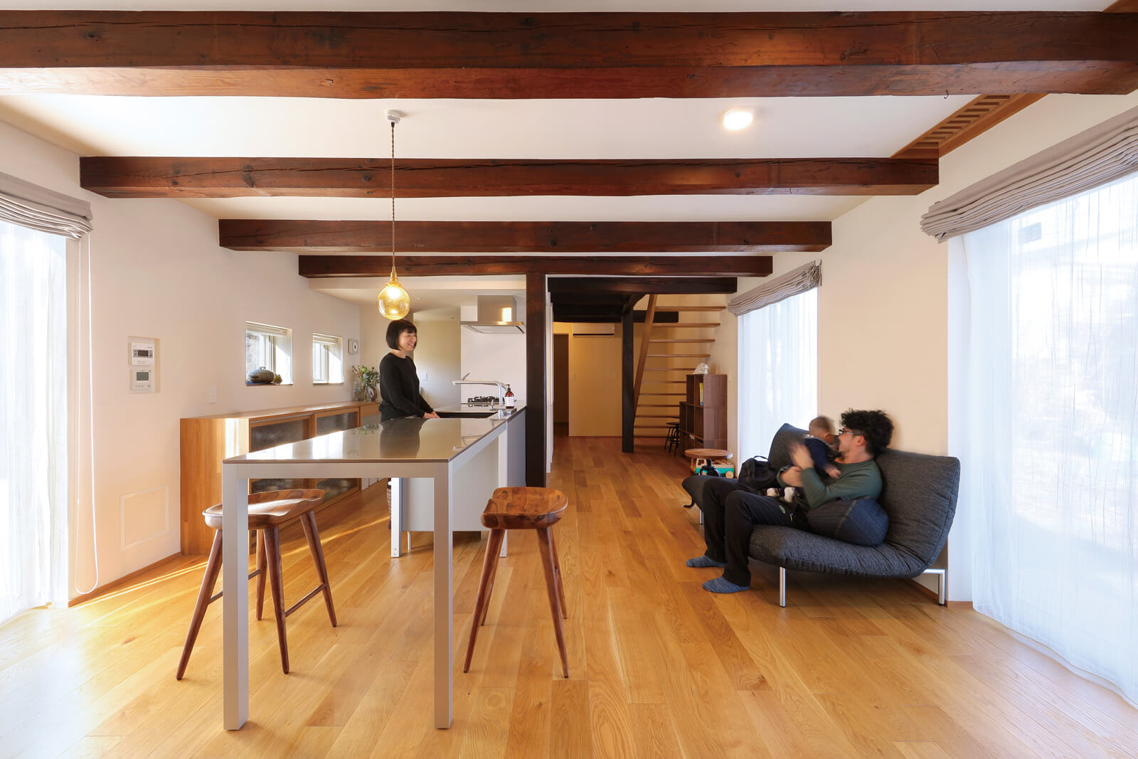 今回のリノベーションで設計担当者は、築100年の蔵の趣や面影を残しつつも、現代的な家族の暮らしに寄り添った快適な空間づくりに心を砕きました。モダンなデザインのキッチンが映えるLDKは、現しの梁の古材ならではの風合いが、空間に深みをもたらしています。室内は断熱性能を高め、高性能なサッシによる大開口で明るさを確保。床暖房で暖められた空気が通風口を通って循環し、家全体が暖まるようにしました。