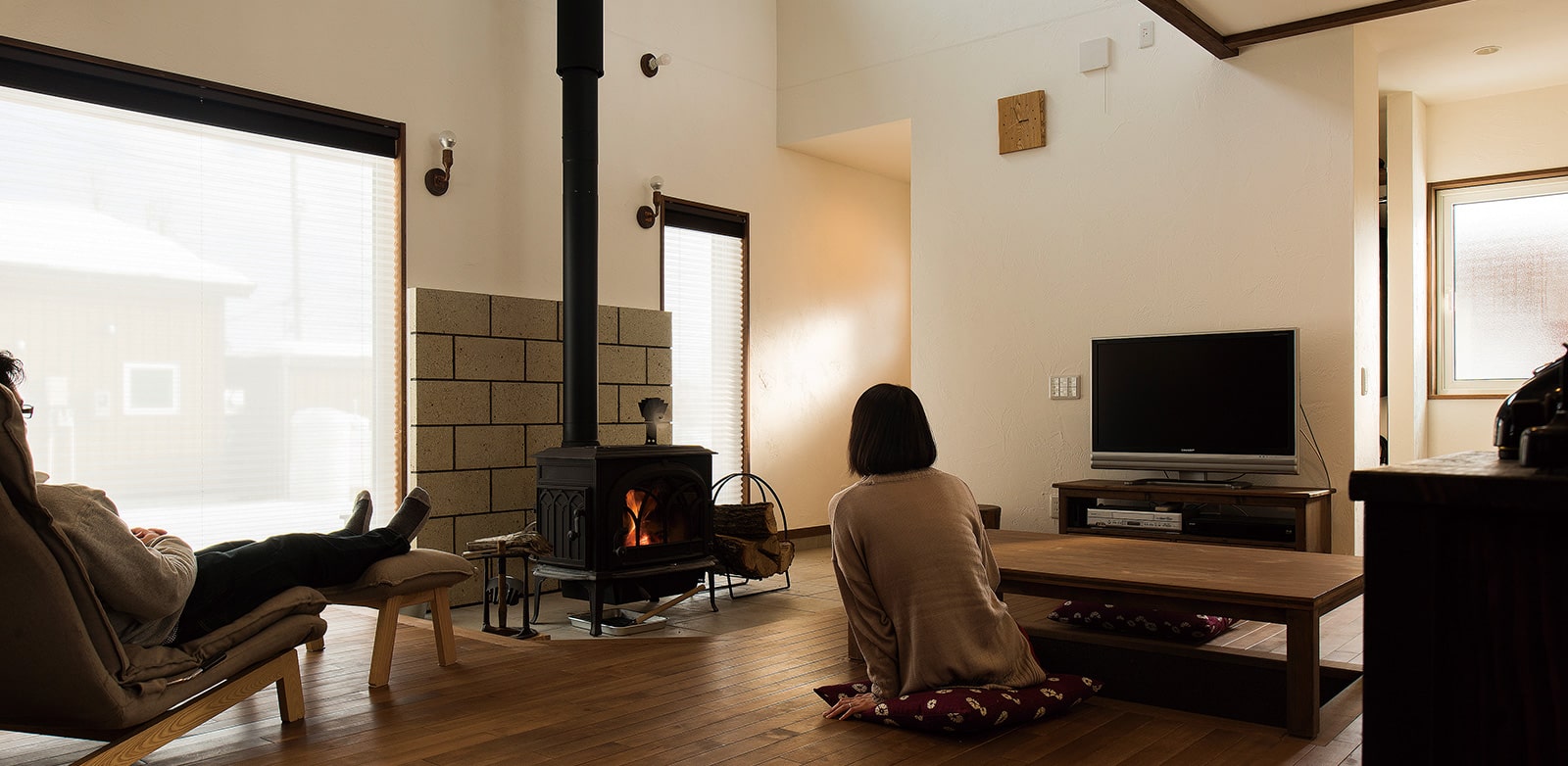 北海道では珍しく、リビングに掘りごたつをつくったのがKさんの住まいの大きな特徴です。奥さんは「掘りごたつがこんなに快適だとは思いませんでした。それに、ここに座ると目線がちょうど薪ストーブの高さになるんです。ぼんやり炎を眺めながら過ごすひとときに、本当に癒やされます」とすっかりお気に入りの様子。