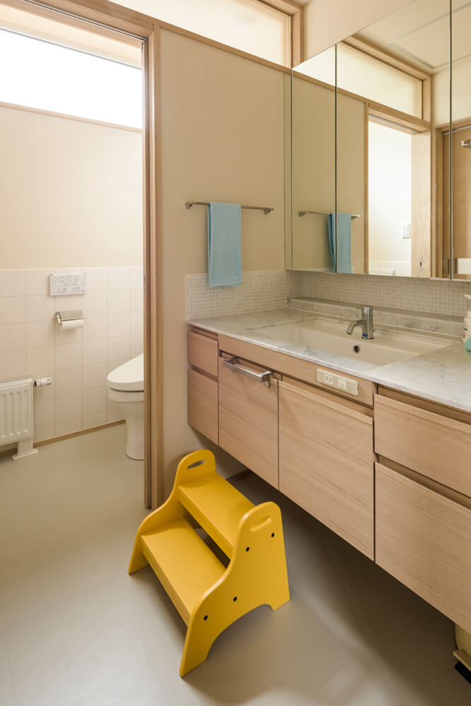 こんな工夫をした家も。隣のトイレ窓からの光を洗面室まで届くよう、間仕切り壁の上にすりガラスを入れて採光を確保しました。側面の壁にも、背面にも窓を設けられなくても、この方法なら洗面台まわりを明るく照らすことができます。
