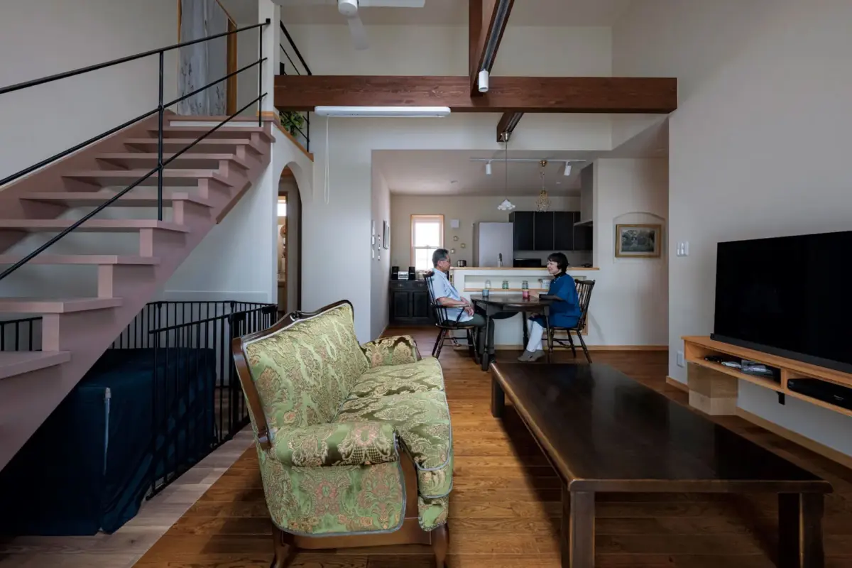 - 二世帯住宅、吹き抜け、回遊動線、平屋、店舗併用、薪ストーブ