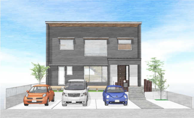 黒いガルスパンの外壁にデザインコンクリート、レッドシダーの組み合わせでスタイリッシュでカッコいいお家が完成しました。