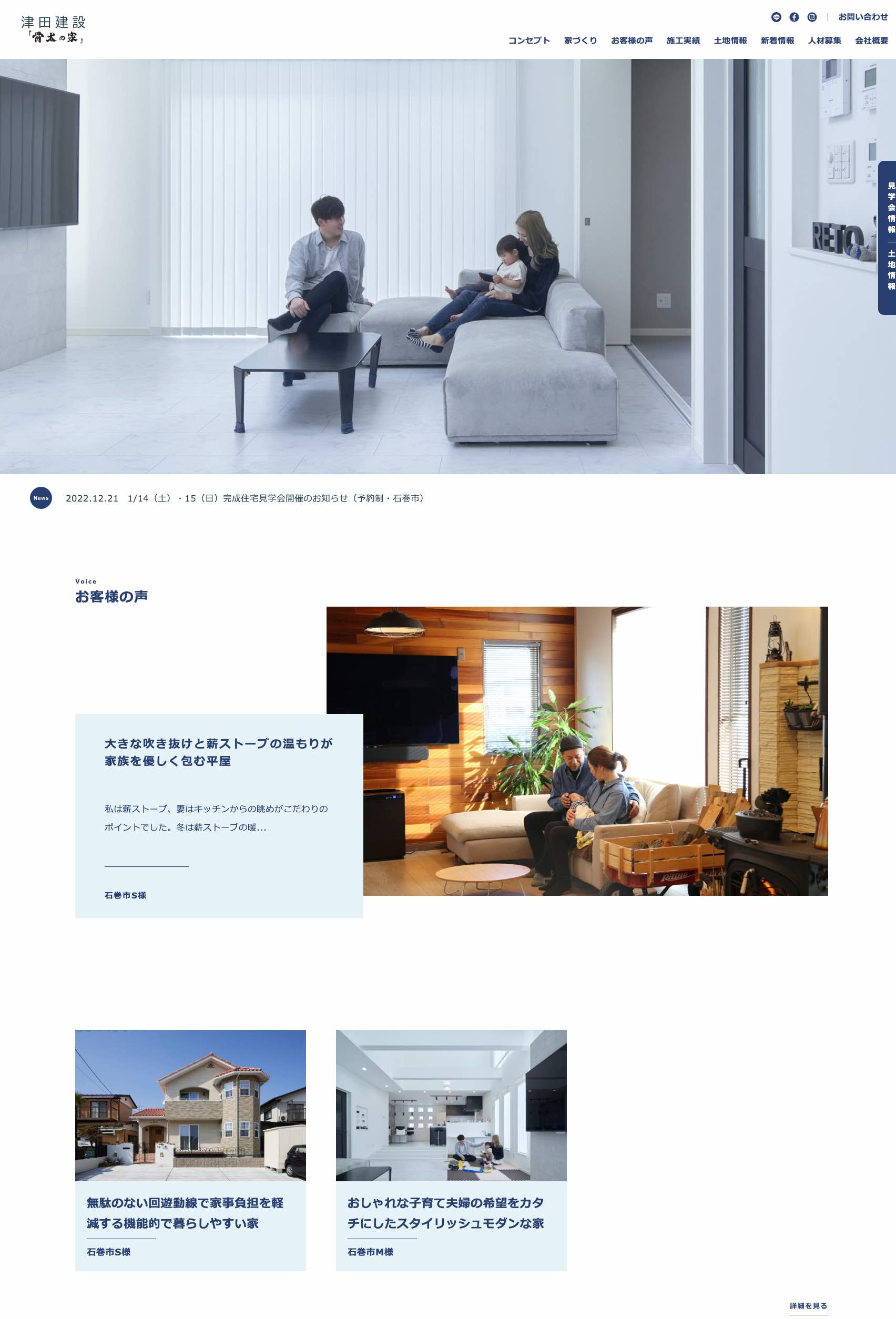 この度、ホームページをリニューアル。お客様がより快適にご利用できるようデザイン・構成を一新し、さらに見やすくなりました。家づくりのこだわりをはじめ、お客様の声や数々の施工実績など、津田建設が提案する住まい・暮らしのことを隅々まで楽しめます。今後も、さらなる内容の充実に努めてまいります。