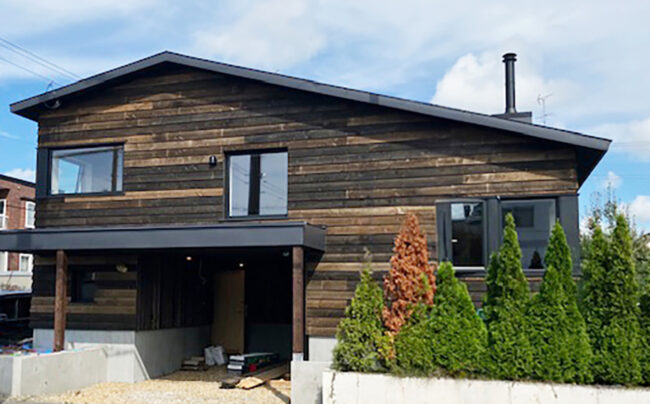 木造2階建、約28坪、道南杉の外壁が素朴でかわいらしい外観。