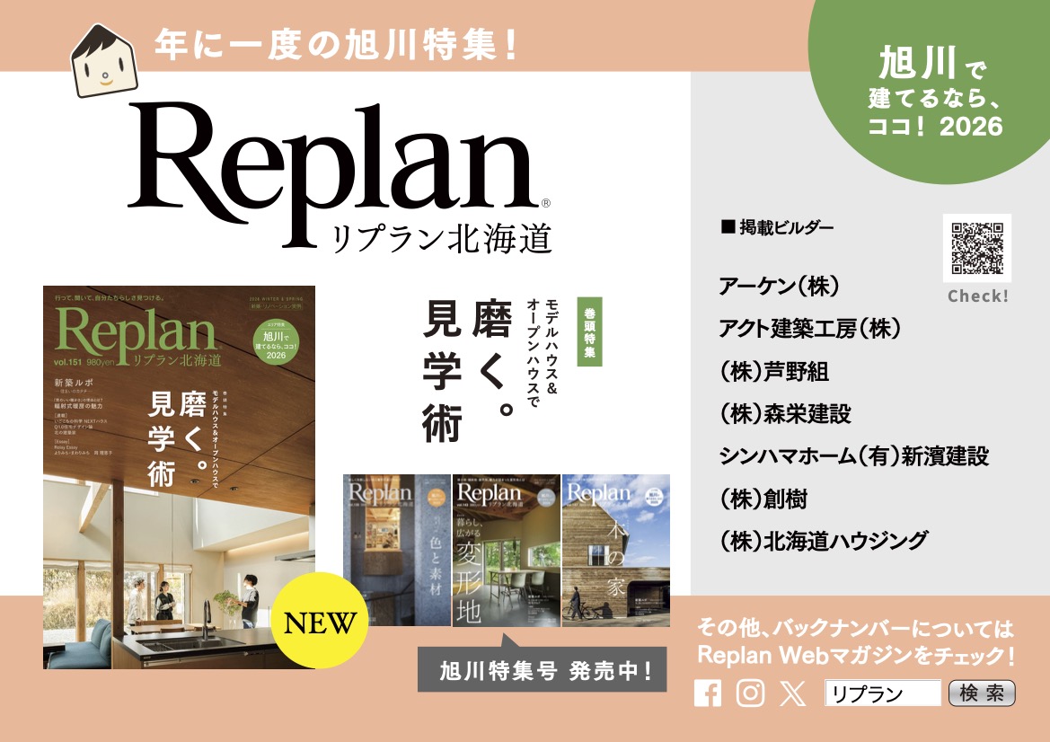 最新号のReplan北海道 vol.151と、住宅雑誌Replanが過去に特集した「旭川特集」の特集号がコーチャンフォー旭川店にて店頭販売中。