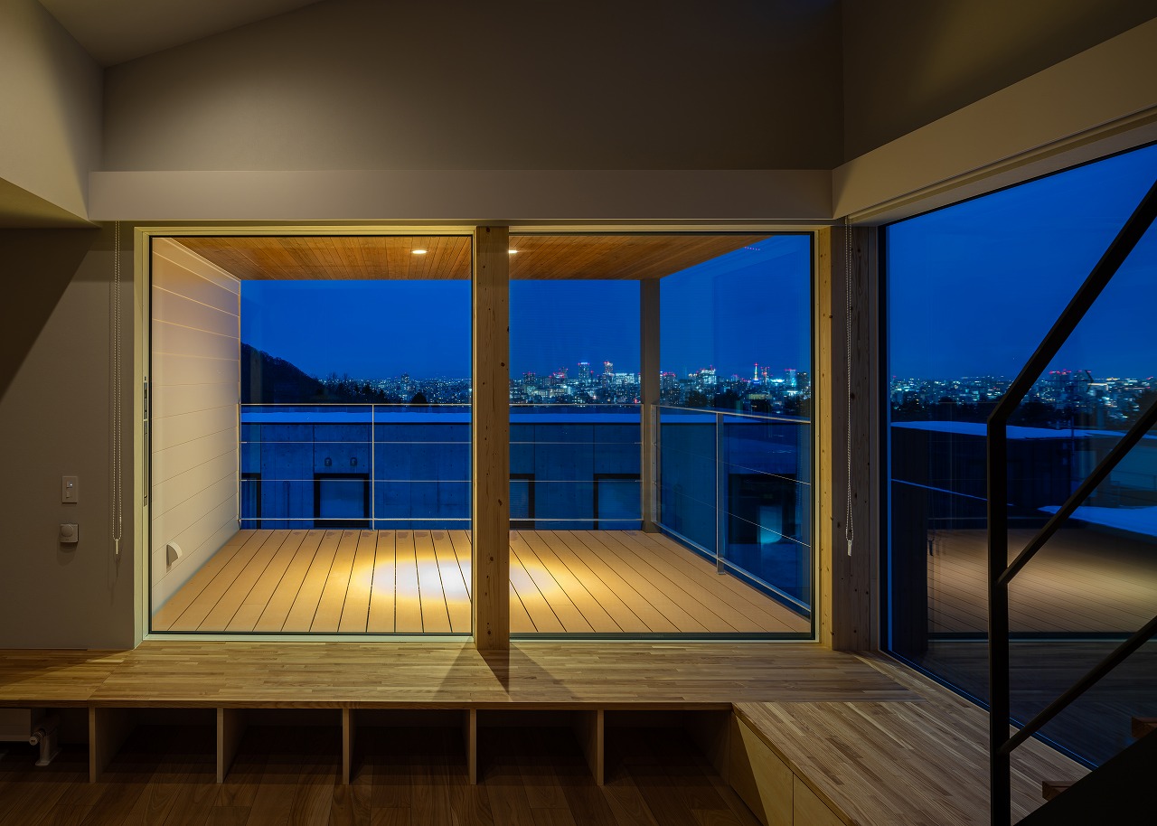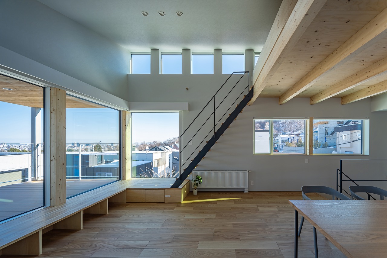 「街景の家」は、札幌の高台に位置し、日常のまちなみを背景として暮らしと景色を緩やかにつなぐ住まいです。敷地から望むのは、屋根の連なりや空の広がりといった生活の気配を含む街景。そこでの暮らしが日々の風景になるように、2階LDKをメインフロアとし、住まいの中に「視線の抜け」と「時間の感じ方」を取り込んで設計しました。