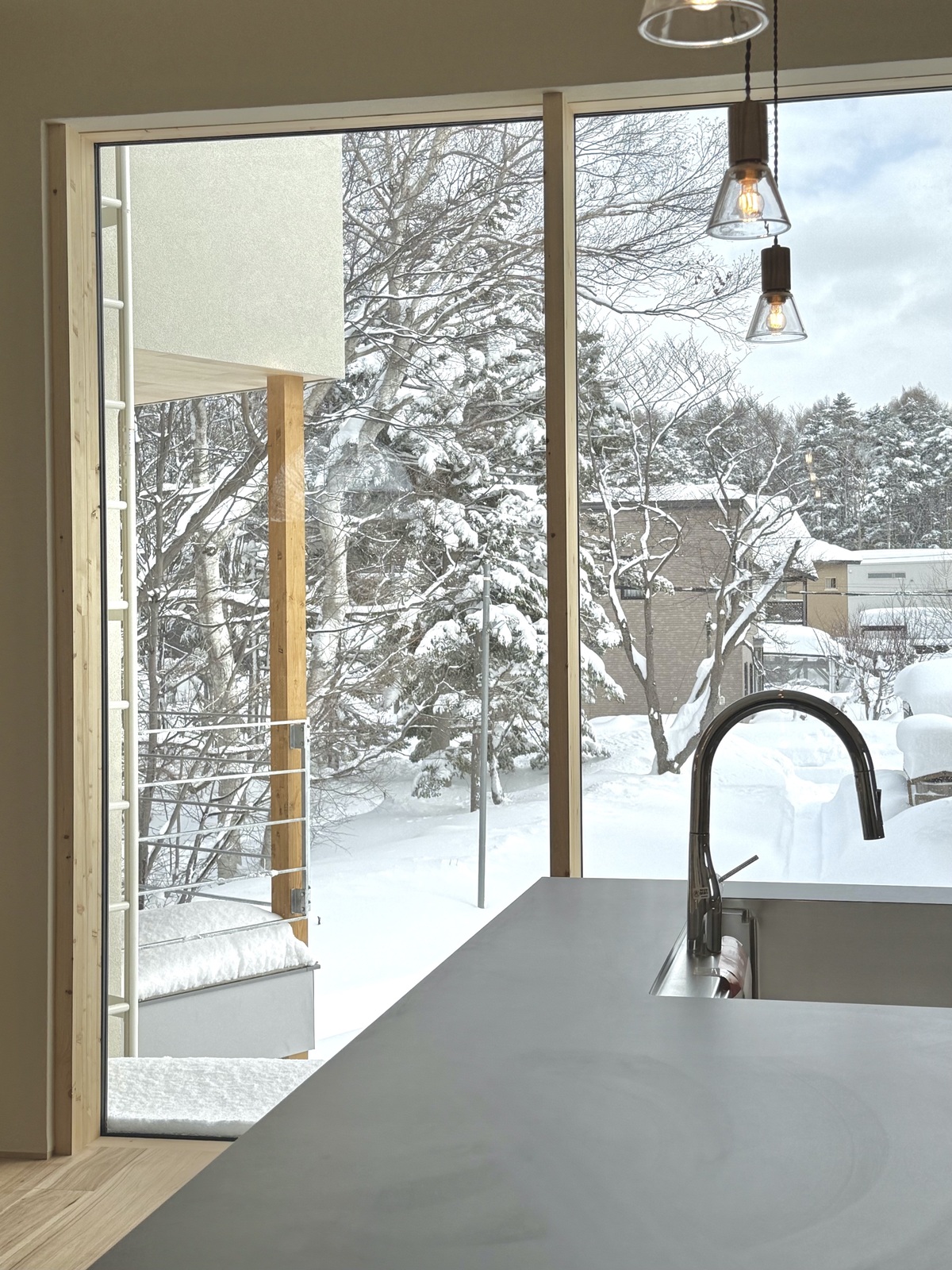 公園脇の敷地に建つこの住宅は、公園の緑を存分に取り込みながら、異なる方向には札幌の山々を望む事もできる贅沢な空間です。