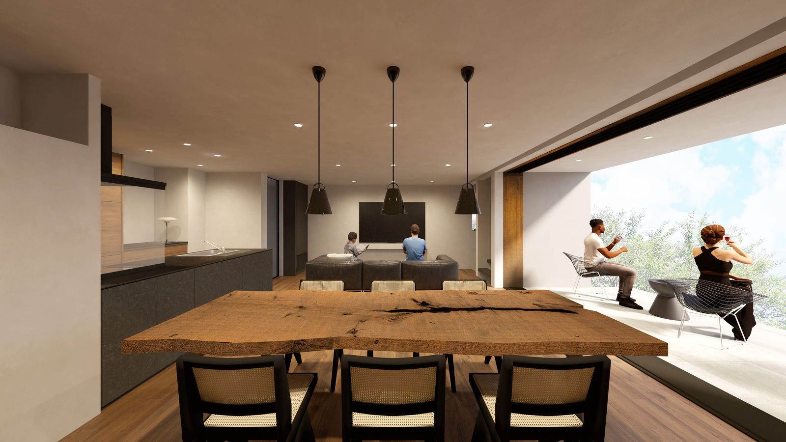 南側に開かれた水辺緑地を臨む敷地で、3階それぞれのフロアごとに異なるスケールや距離感で住まいの中に自然との関係性をデザインした住まいです。