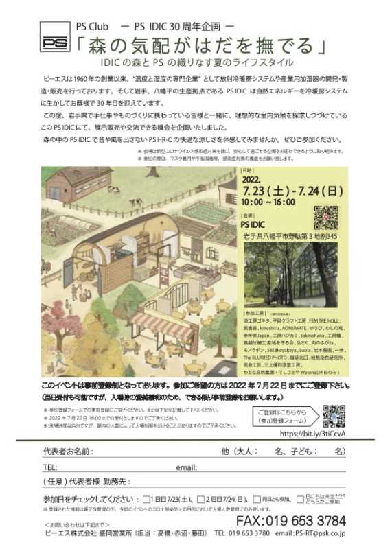 7/23(土)-24(日)| PS Club「森の気配がはだを撫でる」PS IDIC30周年企画 開催のお知らせ | ピーエス(株)盛岡営業所 イベント情報 公開日:2022.7.7 最終更新:2022.7.13
