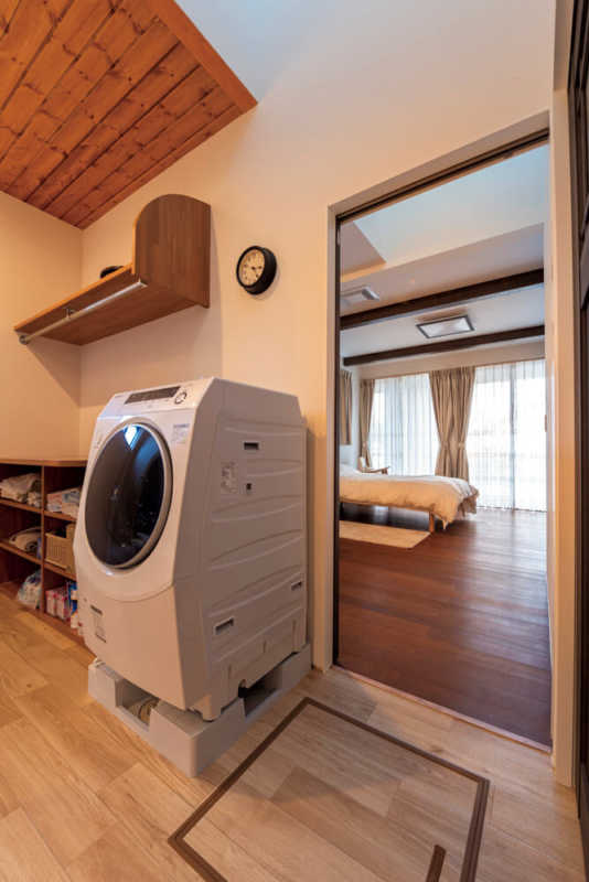 寄せ棟の段屋根とポーチ部分の石張りが高級感を感じさせる住まい。玄関を開けると、広々としたホールに重厚なケヤキの柱や梁、そして奥に望む裏庭の緑が落ち着いた雰囲気を醸します。平屋でありながら明るく開放感を演出する吹き抜け、深い軒を利用しくつろぐことのできるテラスなど、「老後をゆっくりと快適に過ごしたい」という希望を叶えるための工夫が随所に凝らされています。