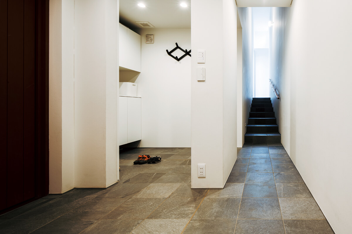 公道側には開口のない住まいに一歩足を踏み入れると、モノトーンの洗練された空間が迎えてくれます。光を抑えたタイル張りの廊下からスキップ階段を半階分上がると景色が一転、中庭と一体となったのびやかで明るいLDKが目の前に。内側に大開口を設けた中2階のLDKと2階のプライベートフロアの中心にある中庭は、子どもの遊び場としても家族の第2のダイニングとしても大活躍します。