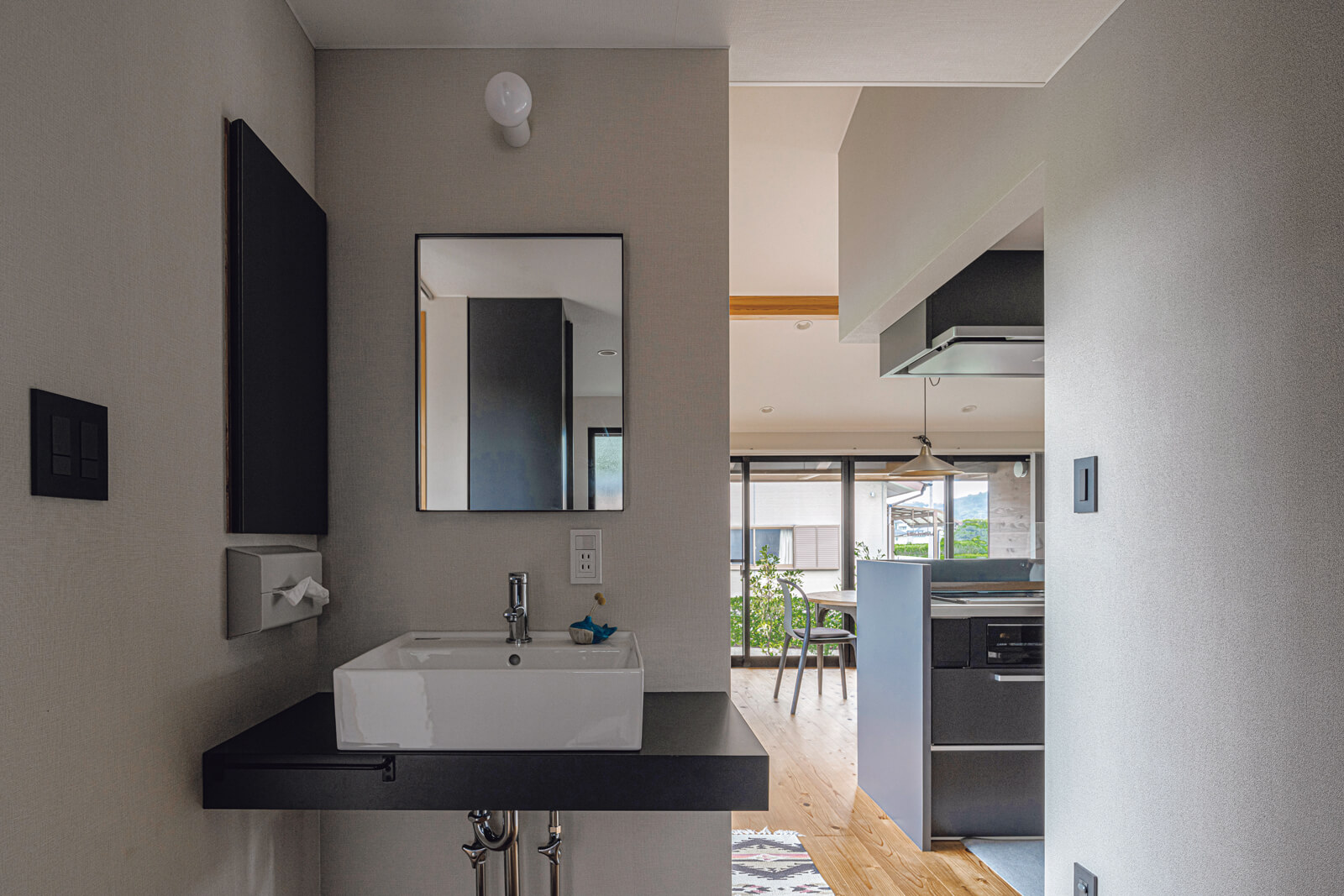 築160年以上の母屋が立つ敷地の一角に、家族4人で住む新居を建設。将来、母屋に暮らすご両親と住まいを交換する可能性などを考慮した、延床面積が約26坪の平屋の住まいです。周辺環境を捉えながら視線の抜けを意識して窓を配置し、建物内の高低差を巧みに利用した設計で、コンパクトさを感じない豊かな日常の場が生まれました。