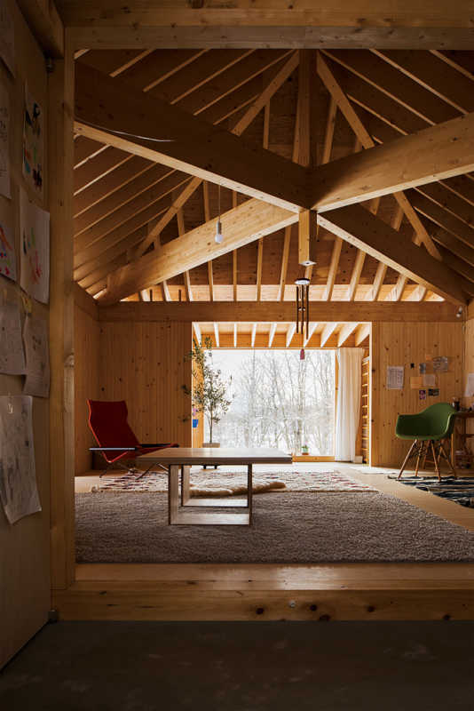 田園と雑木林と沢の風景に馴染む平屋建ての住まい。「最初から他にはない面白い家を建てたいと思っていたんです」というご夫妻の希望通り、室内は大きな1室空間となっていて、その真ん中には、ダイニングでありリビングであり客間にもなる場を配置。その周囲を巡るような土間空間に、キッチンや水まわり、寝室スペースや収納が配置された、可変的で自由な間取りが特徴的です。家族の顔を見ながら、自由にのびのびと暮らせる住まいです。