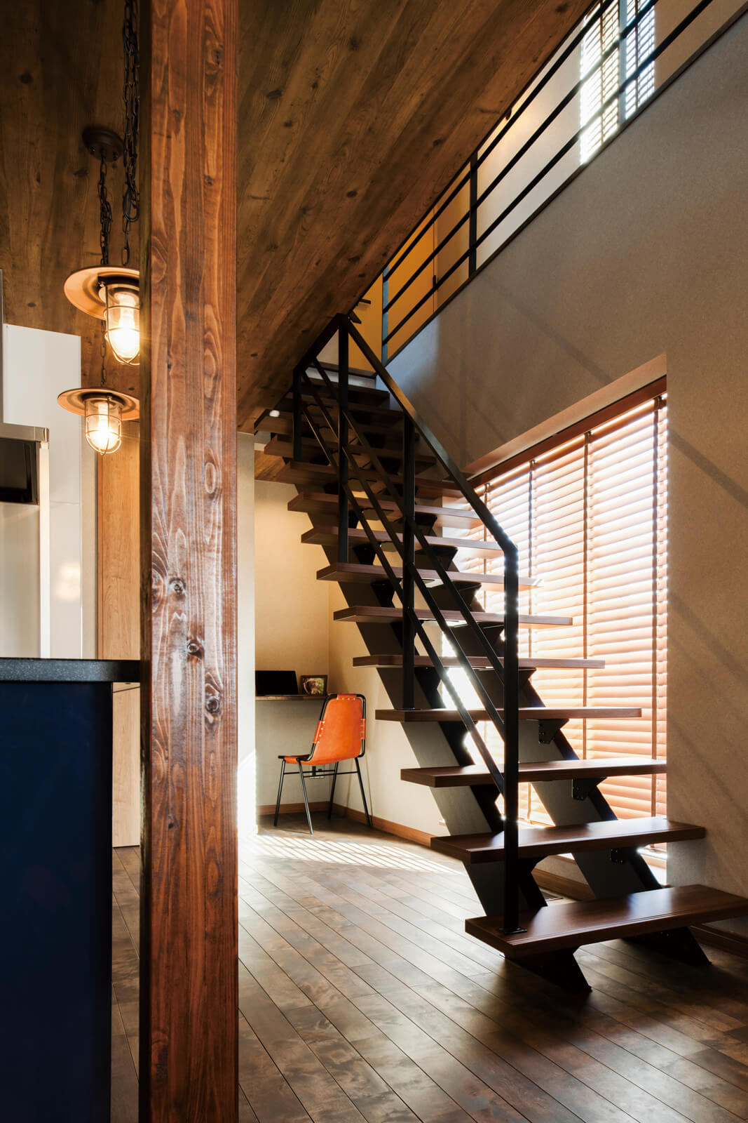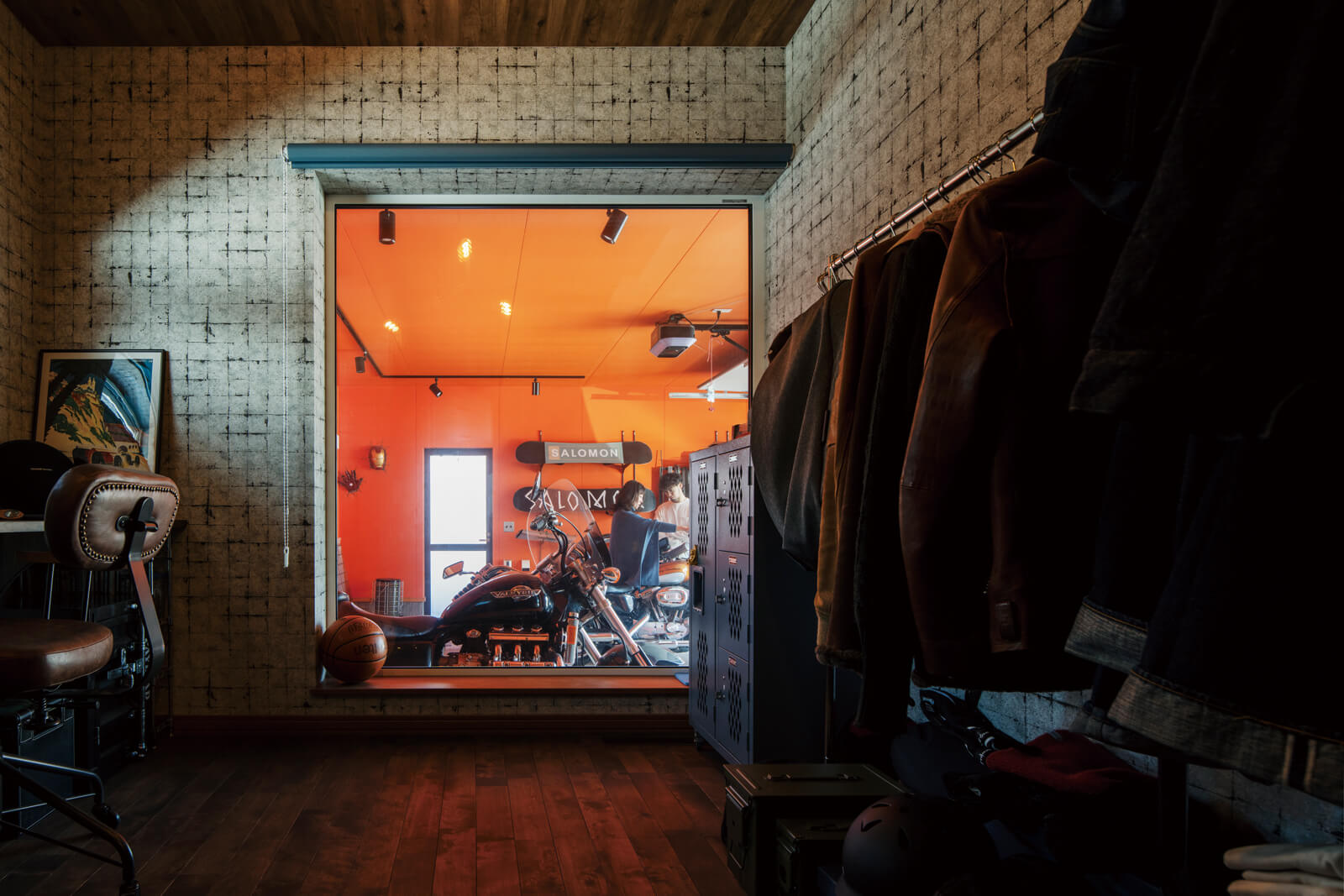 バイク好きが実現した、アメカジスタイルのインナーガレージがある住まい。広い玄関ホールを介してLDKとガレージをつなげ、いつでも愛車を眺められる憧れの空間を形にしました。そばには趣味部屋も設え、大きな窓ガラスからも自慢のガレージを見渡せます。デザインへのこだわりに加え、太陽光発電パネルと蓄電池を備えた「ZEH+」や「全館空調」を採用し、高い住宅性能も確保。一年中どこにいても温度差のない快適な室内環境が整いました。家具をDIYするなど、趣味と心地よさが同居する充実した暮らしを楽しんでいます。