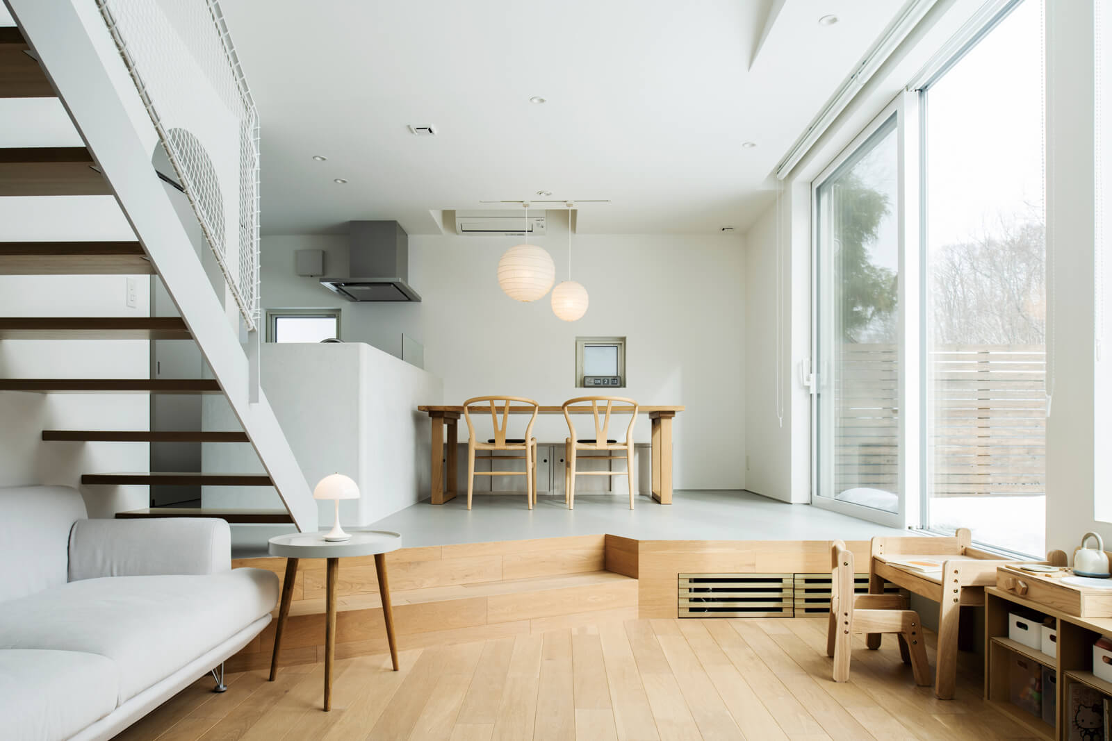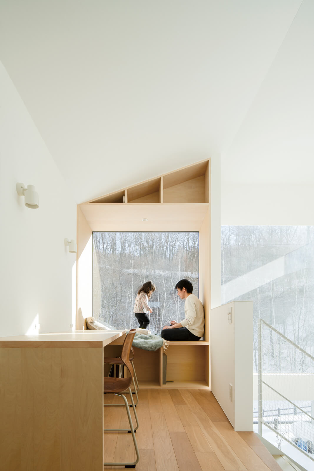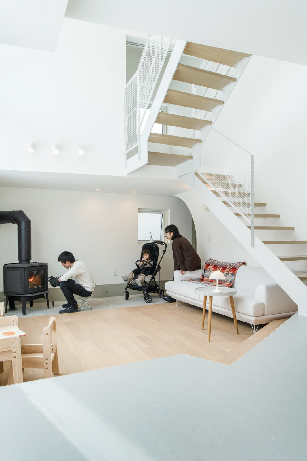 「森の近くで、炎を眺めて暮らしたい」。キャンプ好きのご夫妻は、東側に森が広がる理想の地に新居を構えました。玄関から続く広いコンクリート土間は、薪ストーブの炉台を兼ね、愛用の道具を手入れする場としても活躍。この土間を起点に、リビングやダイニング・キッチン、中2階、2階ホールがスキップフロアで軽やかにつながり、どの場所からも森の景色と対峙できる設計としました。窓越しの自然と連続するような室内外の一体感に包まれながら、静かな森の気配とともに過ごす、心豊かな日々が流れています。