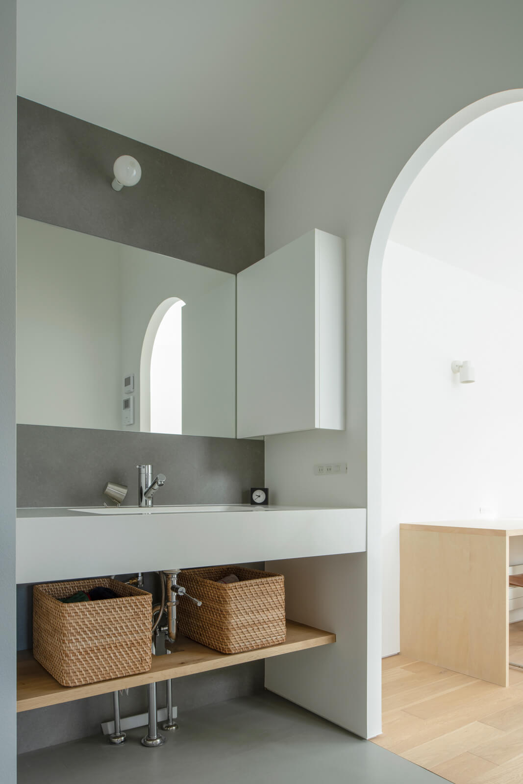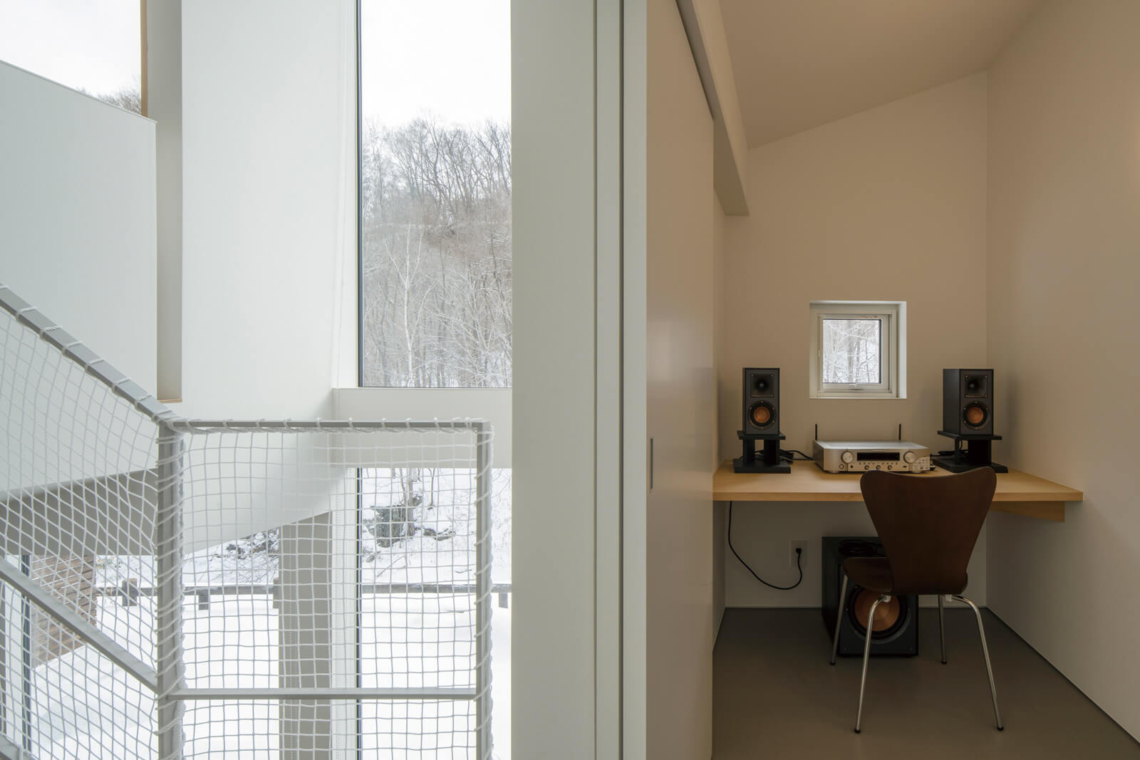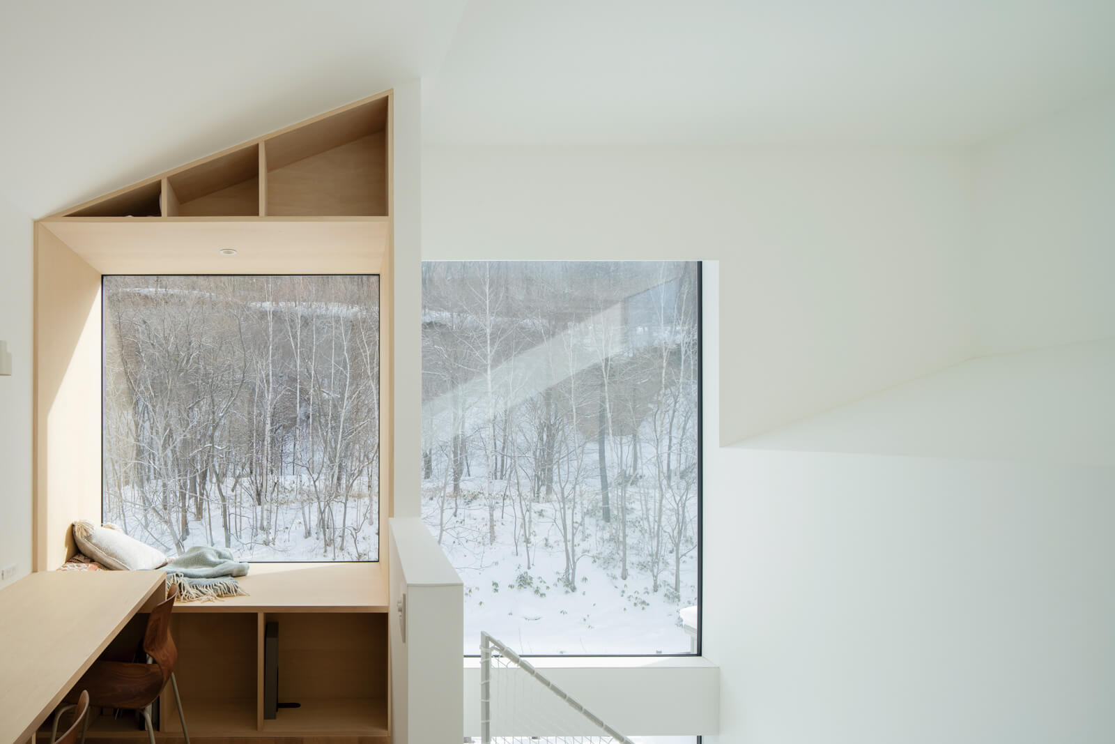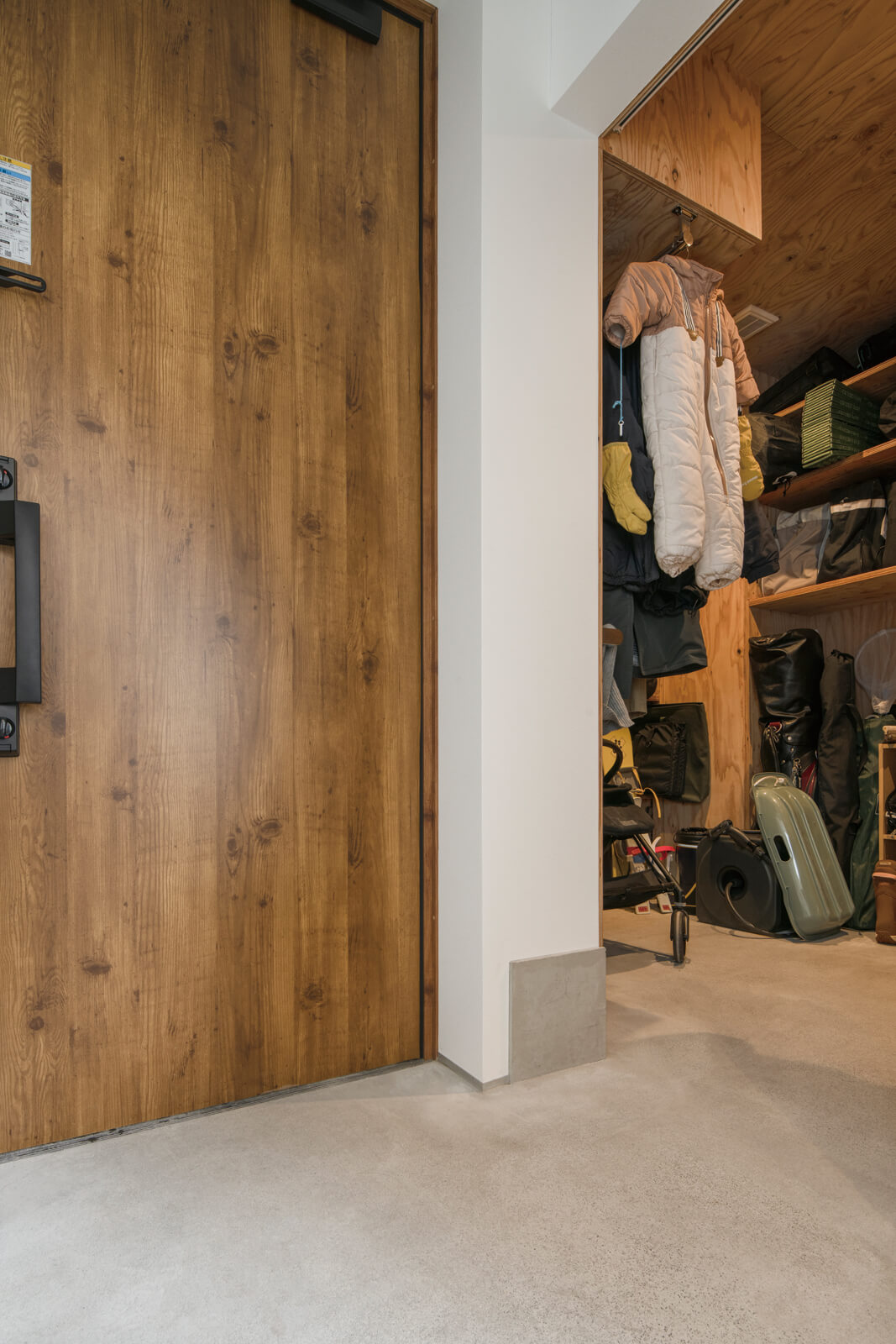 「森の近くで、炎を眺めて暮らしたい」。キャンプ好きのご夫妻は、東側に森が広がる理想の地に新居を構えました。玄関から続く広いコンクリート土間は、薪ストーブの炉台を兼ね、愛用の道具を手入れする場としても活躍。この土間を起点に、リビングやダイニング・キッチン、中2階、2階ホールがスキップフロアで軽やかにつながり、どの場所からも森の景色と対峙できる設計としました。窓越しの自然と連続するような室内外の一体感に包まれながら、静かな森の気配とともに過ごす、心豊かな日々が流れています。
