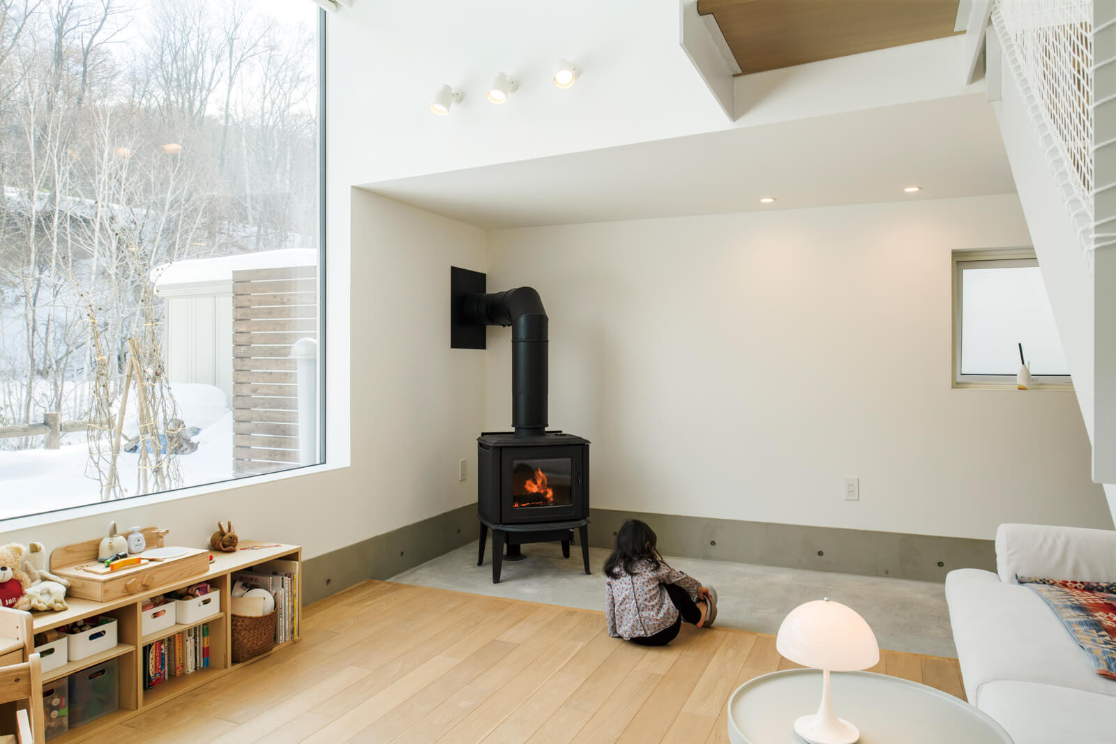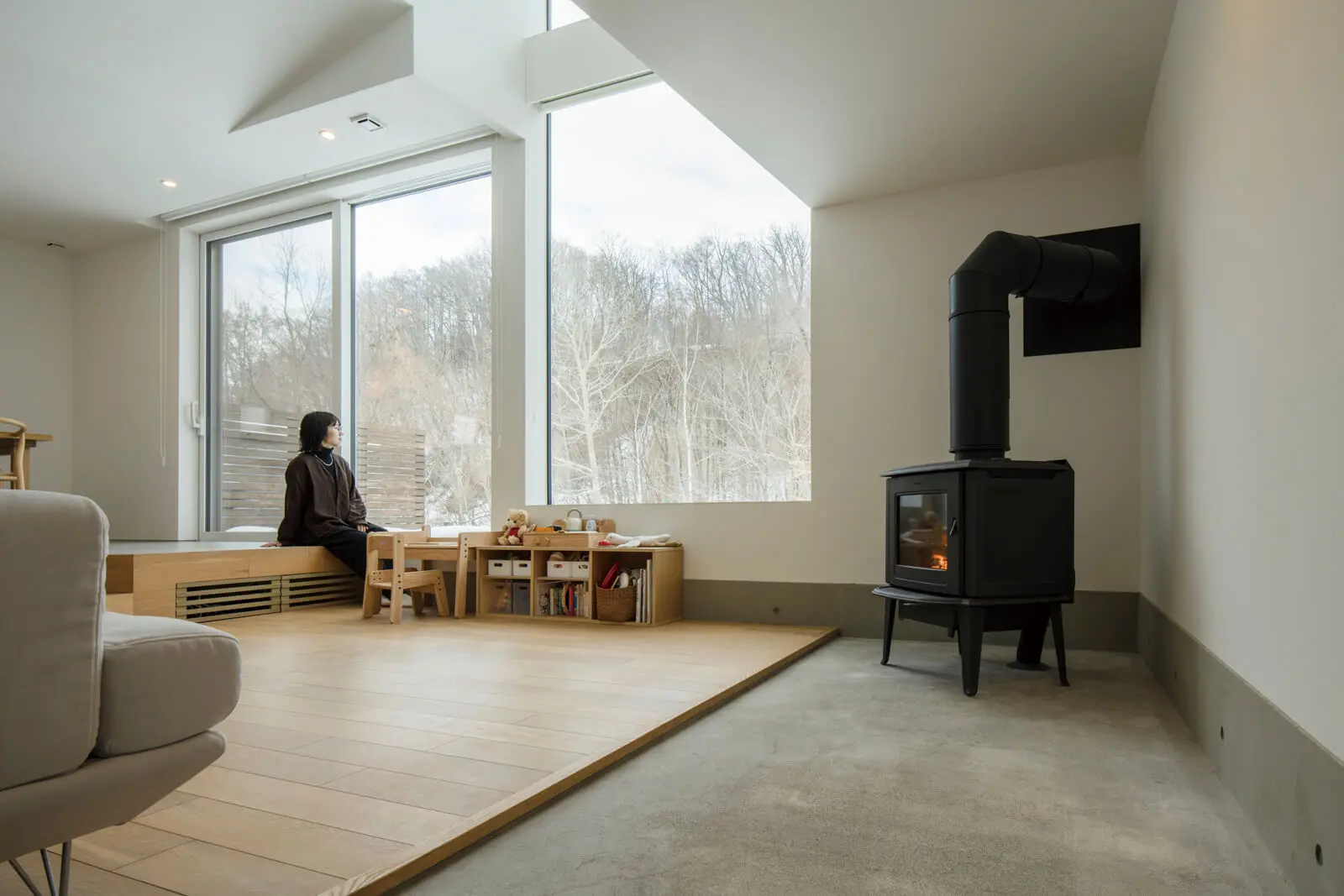 森とつながるスキップフロア。土間と薪ストーブのある暮らし