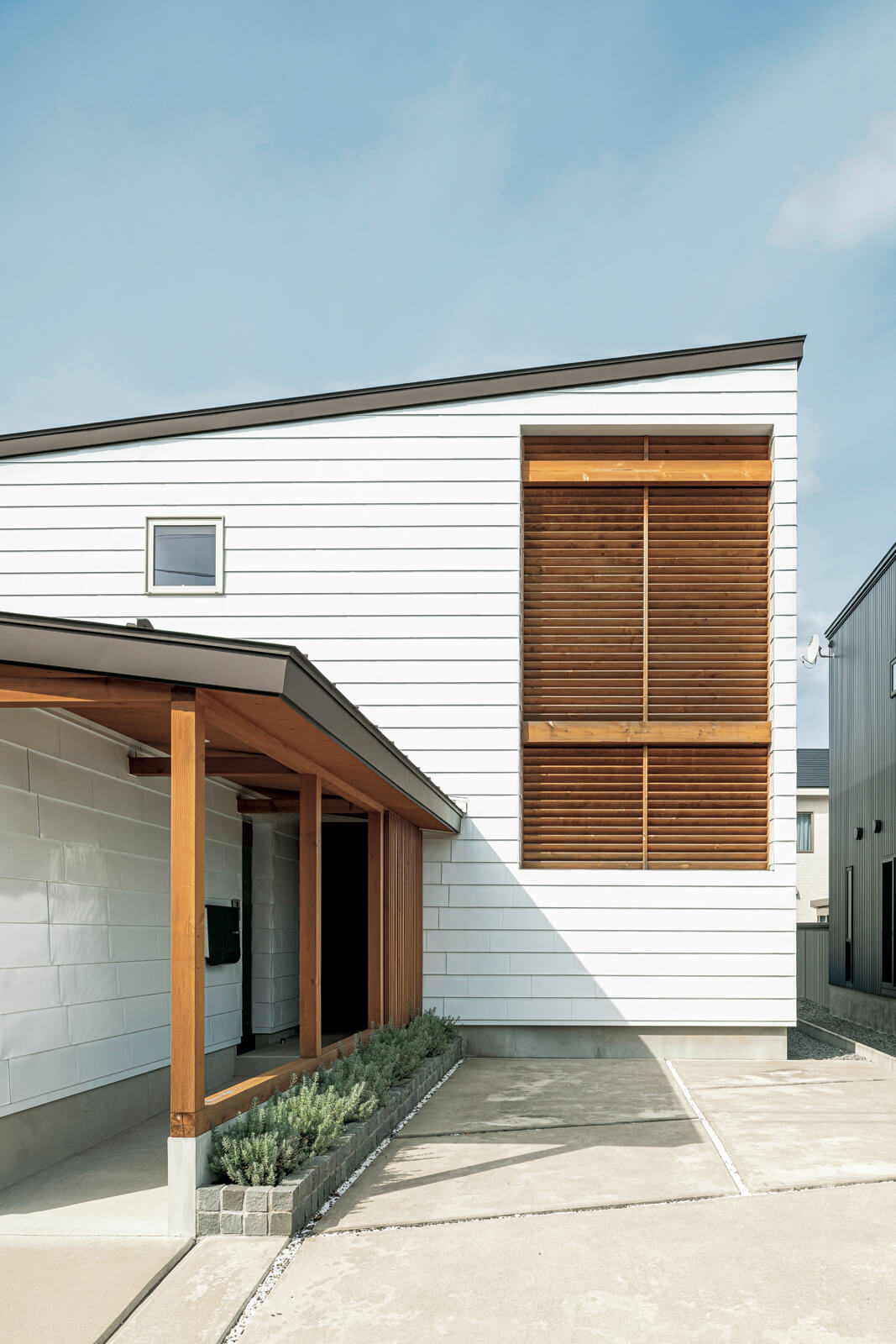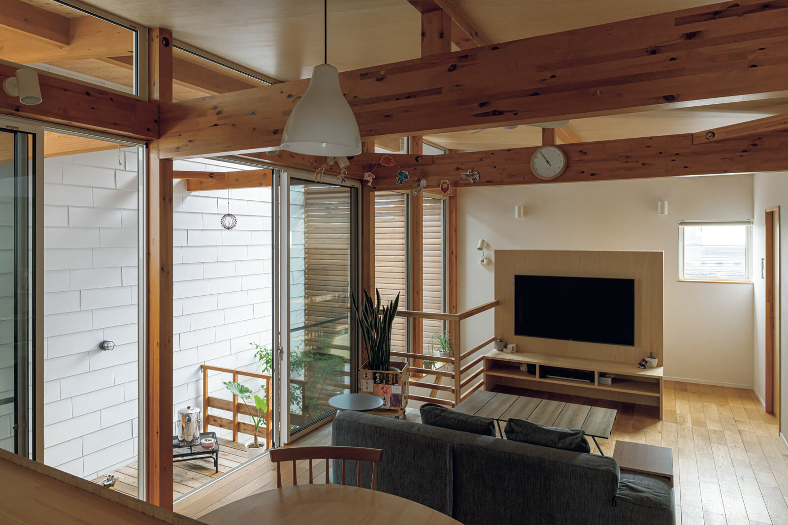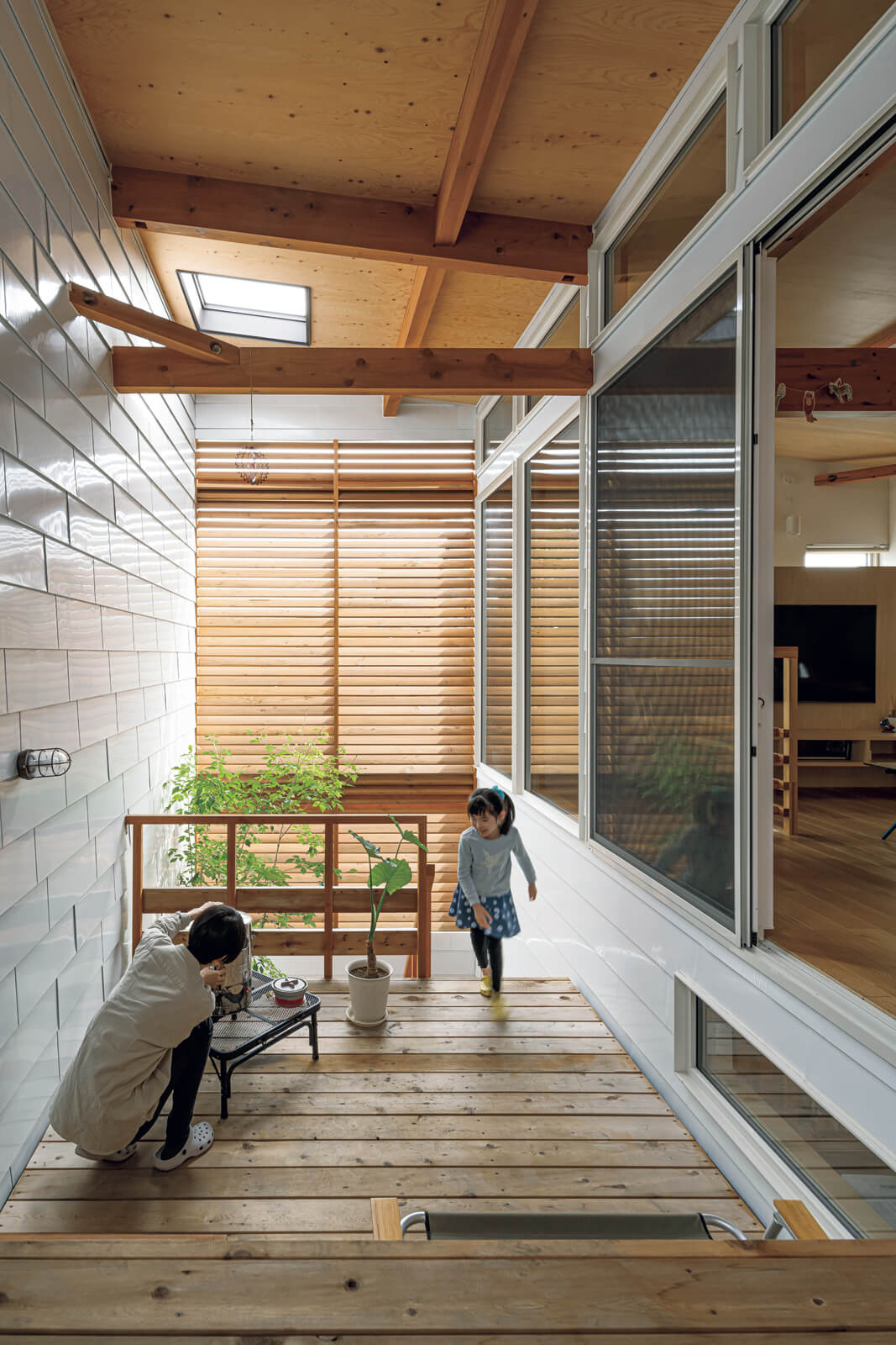 隣家が近接する住宅街で、視線を気にせず自然を感じたい。その想いに応えたのは、木のルーバーと屋根に包まれた大胆な半外空間でした。1階から中2階、2階リビングとつながるこのテラスは、外からの視線を遮りつつ、光や風、雨の音までも心地よく室内へと招き入れます。テラスに面した窓はすべてトリプルガラスの高性能仕様で、室内はいつでも快適温度。インドア派だったご家族も、今ではテラスで燻製料理を楽しむのが日常になりました。プライバシーが守られた安心感の中で、空を見上げながらのびのびと暮らしています。