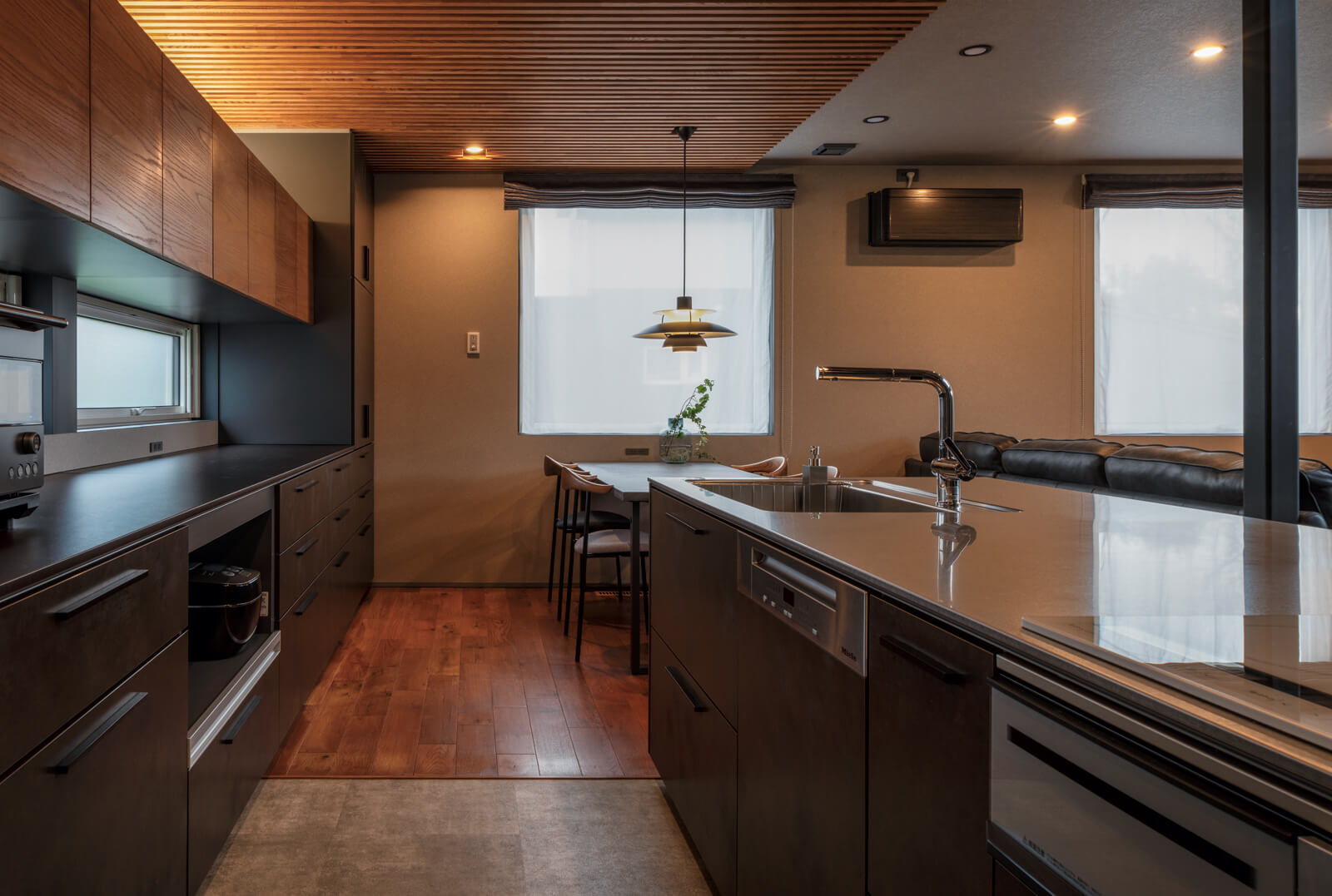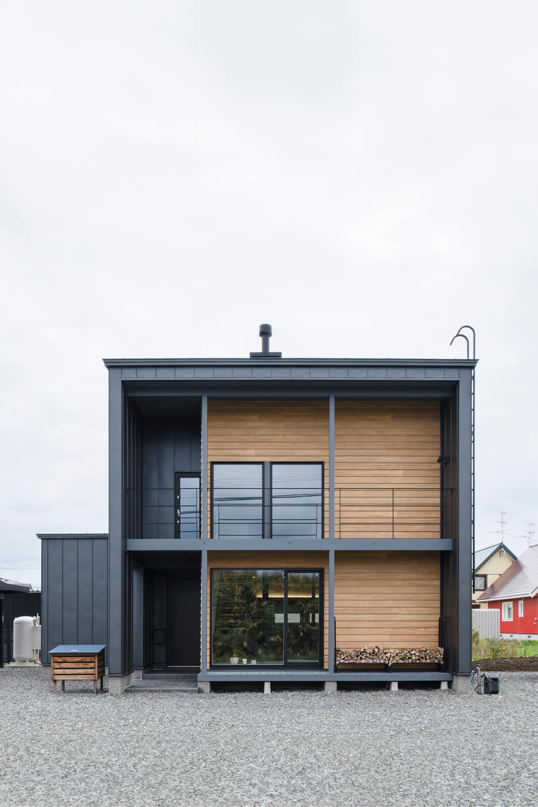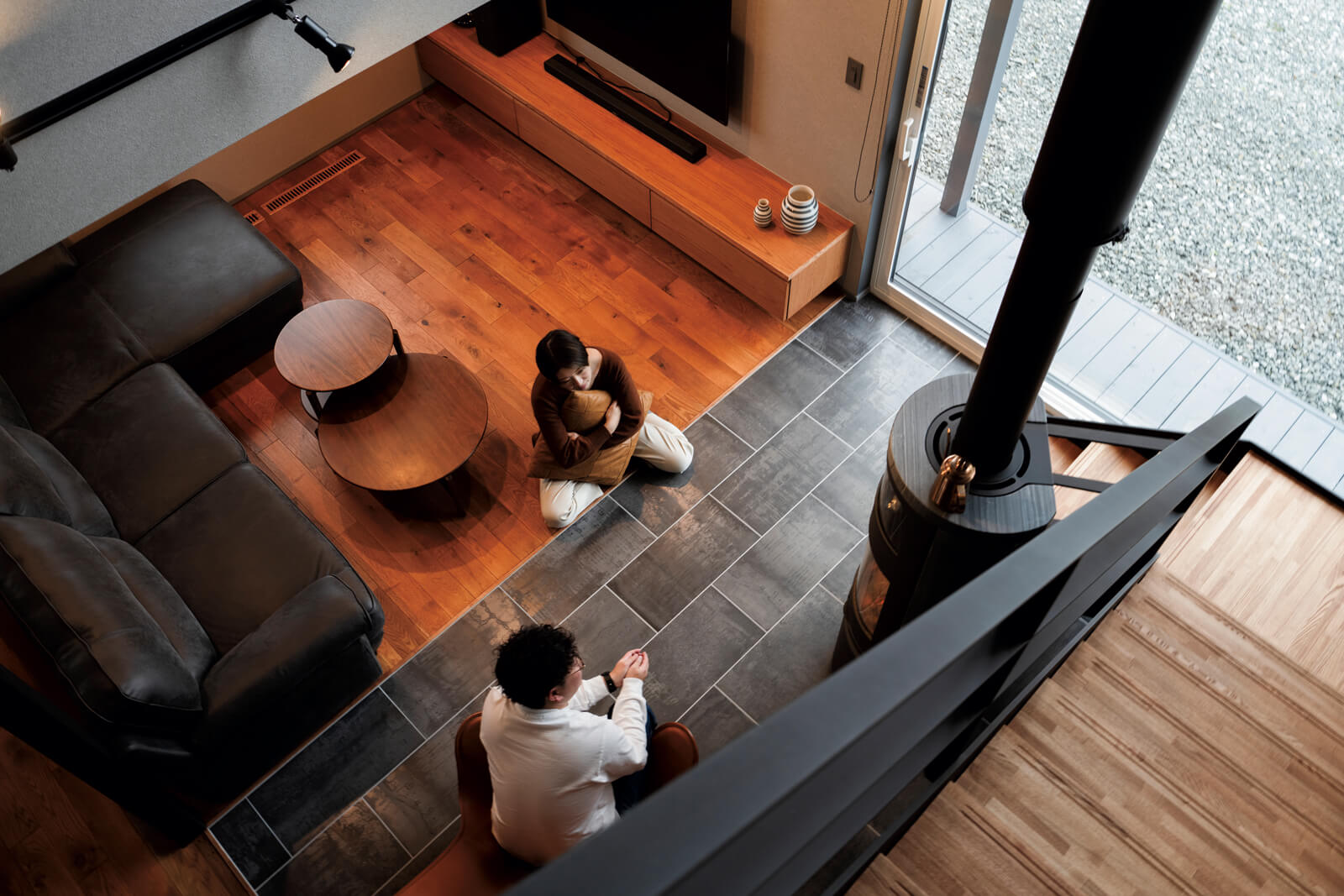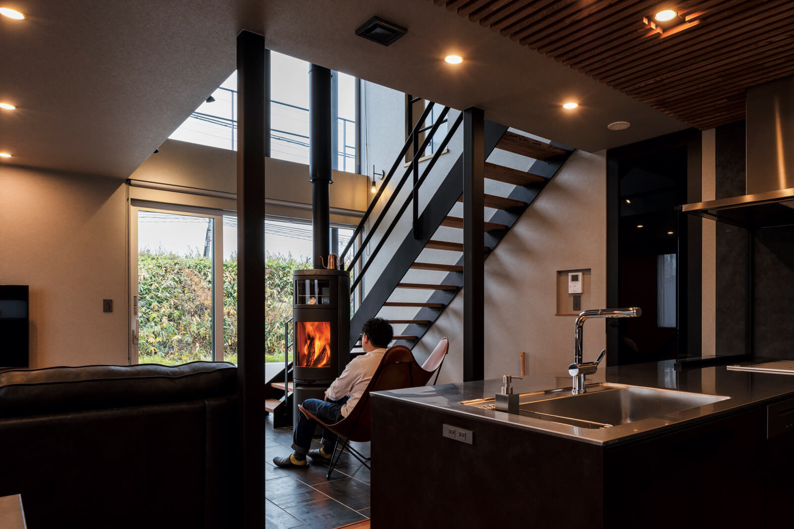 木とブラックのデザインを楽しむ、薪ストーブのある心地よい家