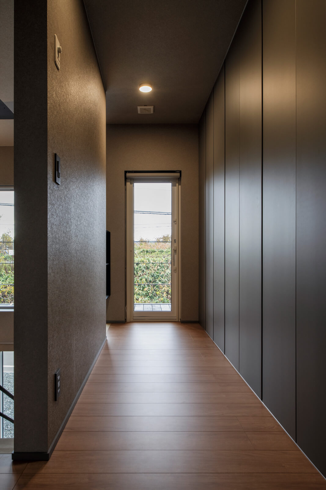 見学会で出会ったD-PLUSのデザインに惹かれ、Sさんご夫妻は家づくりを決意。Sさんが望んだ薪ストーブや吹き抜けと、奥さんが好む落ち着きのある内装が調和し、木とブラックを基調としたスタイリッシュな空間が完成しました。5.2mの吹き抜けがLDKに開放感をもたらし、デンマーク製の薪ストーブやクエロのバタフライチェアなど、お気に入りのインテリアがやわらかい雰囲気をまとわせます。玄関横の大型収納や壁面を活用したクローゼットなど、機能面も充実。UA値0.27という高い断熱性能に守られ、「好き」を形にした心地よい暮らしが始まっています。
