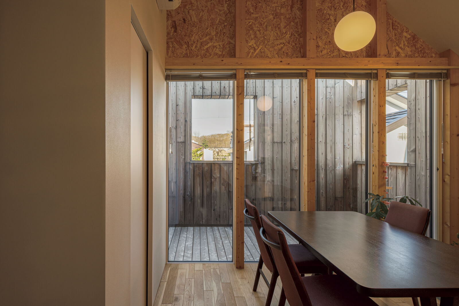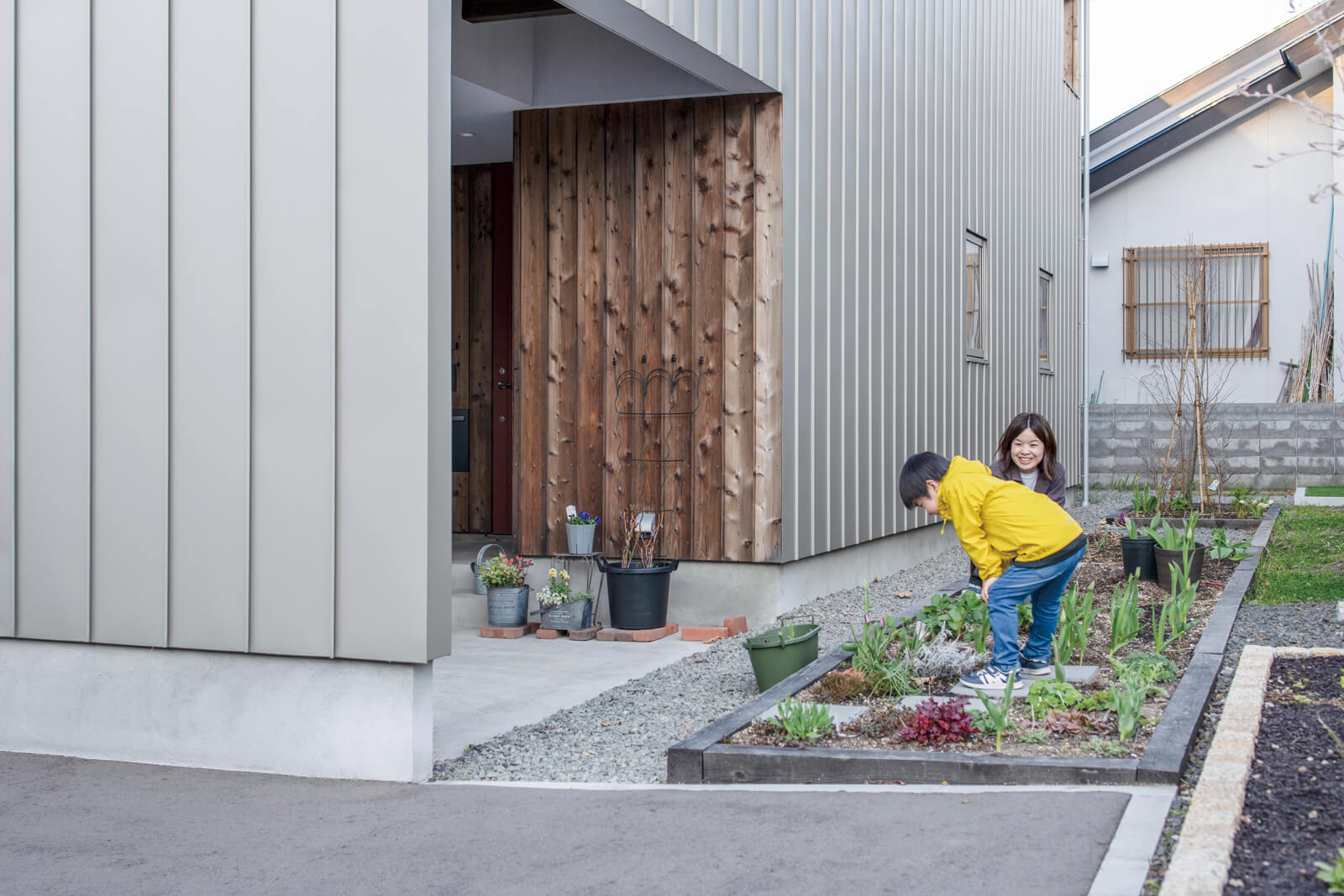 札幌市内のマンションで暮らしていたTさんご一家は、コロナ禍を機に、自然に近い環境でのびのびと子育てをしたいと家づくりを決めました。新居は、狭小地に建つ延床面積約34坪のコンパクトな2階建ての住まい。2階LDKの東西には「空庭」と名付けた半屋外スペースを配置。大きな窓が内と外のつながりを生み、面積以上の広がりを感じさせます。暖かい季節は外で食事を楽しみ、冬は子どもの雪遊び場としても活用。多様な野菜が実る家庭菜園や空庭を介して外とのつながりを感じる日々を満喫しています。