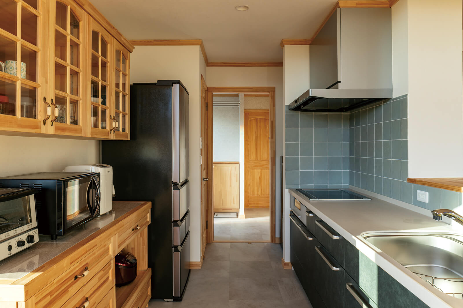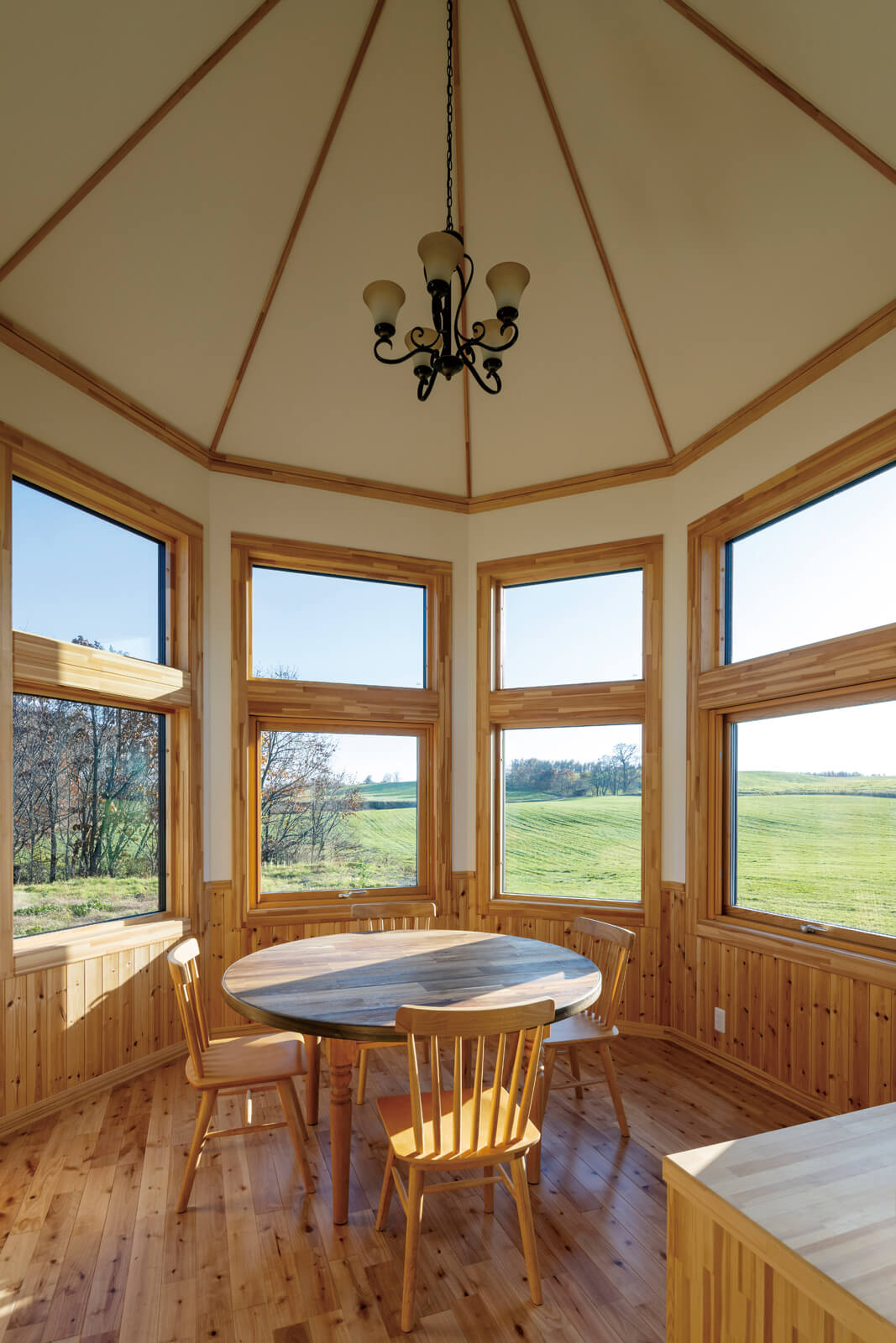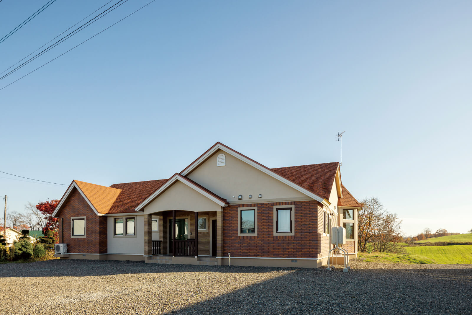 大小の三角屋根と塔屋が印象的な平屋。日々酪農に従事するAさんご夫妻にとって、この住まいは仕事の活力を養う大切な休息の場です。愛猫のための造作ベンチやカントリー調の意匠が、何気ない日常に彩りを添えてくれます。奥さんの希望が叶ったキッチンでは、陽だまりでくつろぐ家族の気配を感じながら、隣接する将来の子ども部屋を一望できるのも注目のポイントです。パイン材の温もりに包まれた室内には大開口を設け、十勝らしい雄大な眺望を暮らしの背景に、休息のひとときを慈しむ。そんな穏やかな時間が、明日への活力へと変わっていきます。