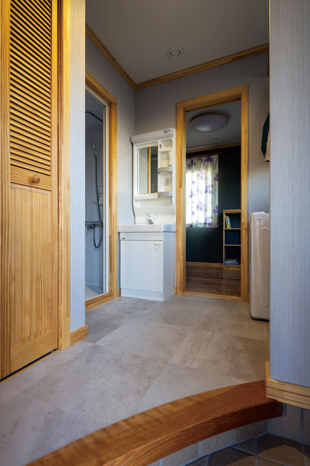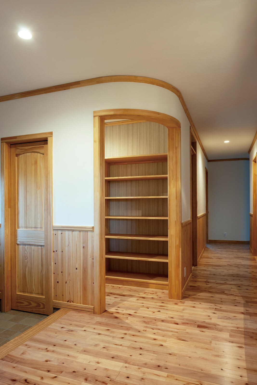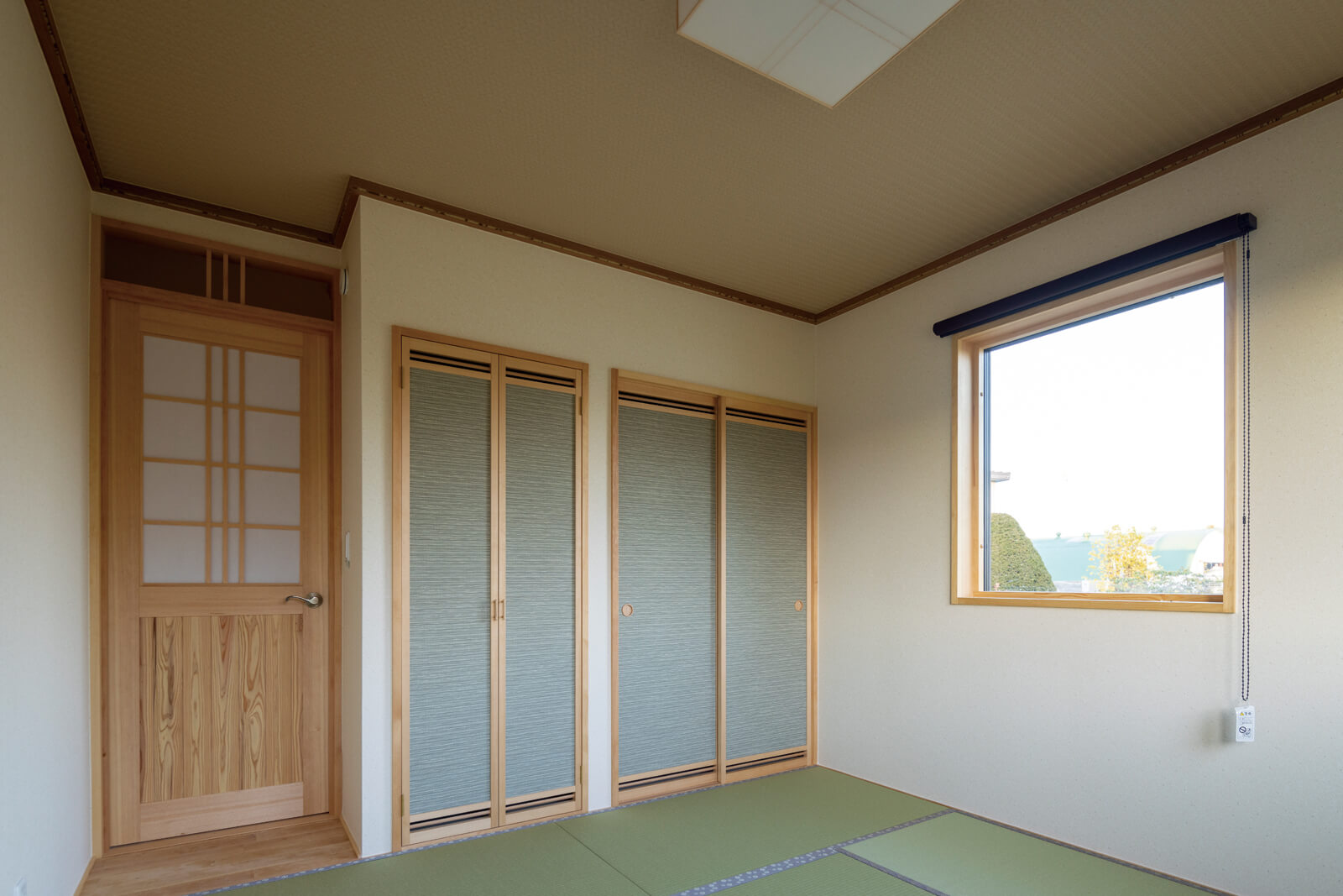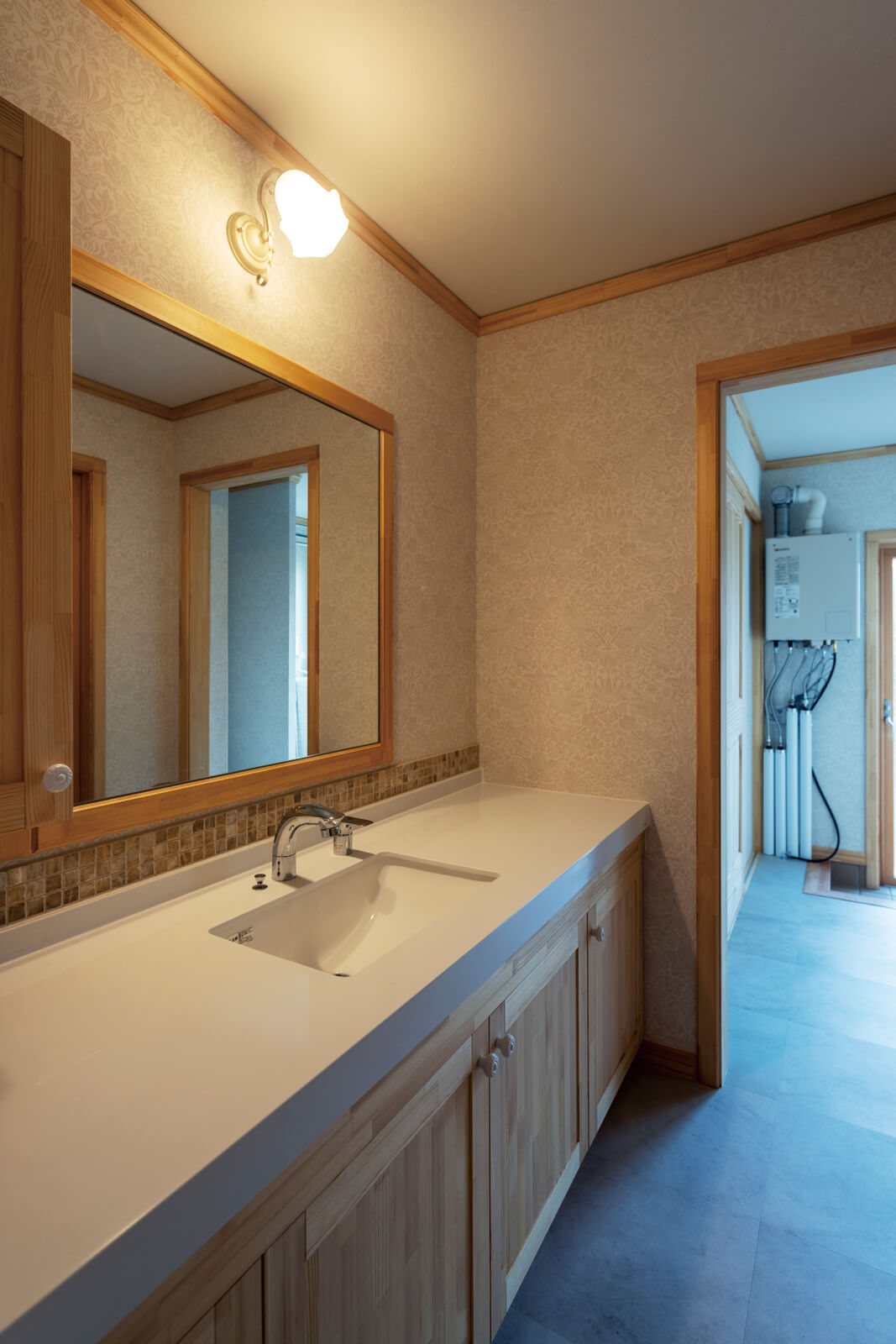 大小の三角屋根と塔屋が印象的な平屋。日々酪農に従事するAさんご夫妻にとって、この住まいは仕事の活力を養う大切な休息の場です。愛猫のための造作ベンチやカントリー調の意匠が、何気ない日常に彩りを添えてくれます。奥さんの希望が叶ったキッチンでは、陽だまりでくつろぐ家族の気配を感じながら、隣接する将来の子ども部屋を一望できるのも注目のポイントです。パイン材の温もりに包まれた室内には大開口を設け、十勝らしい雄大な眺望を暮らしの背景に、休息のひとときを慈しむ。そんな穏やかな時間が、明日への活力へと変わっていきます。