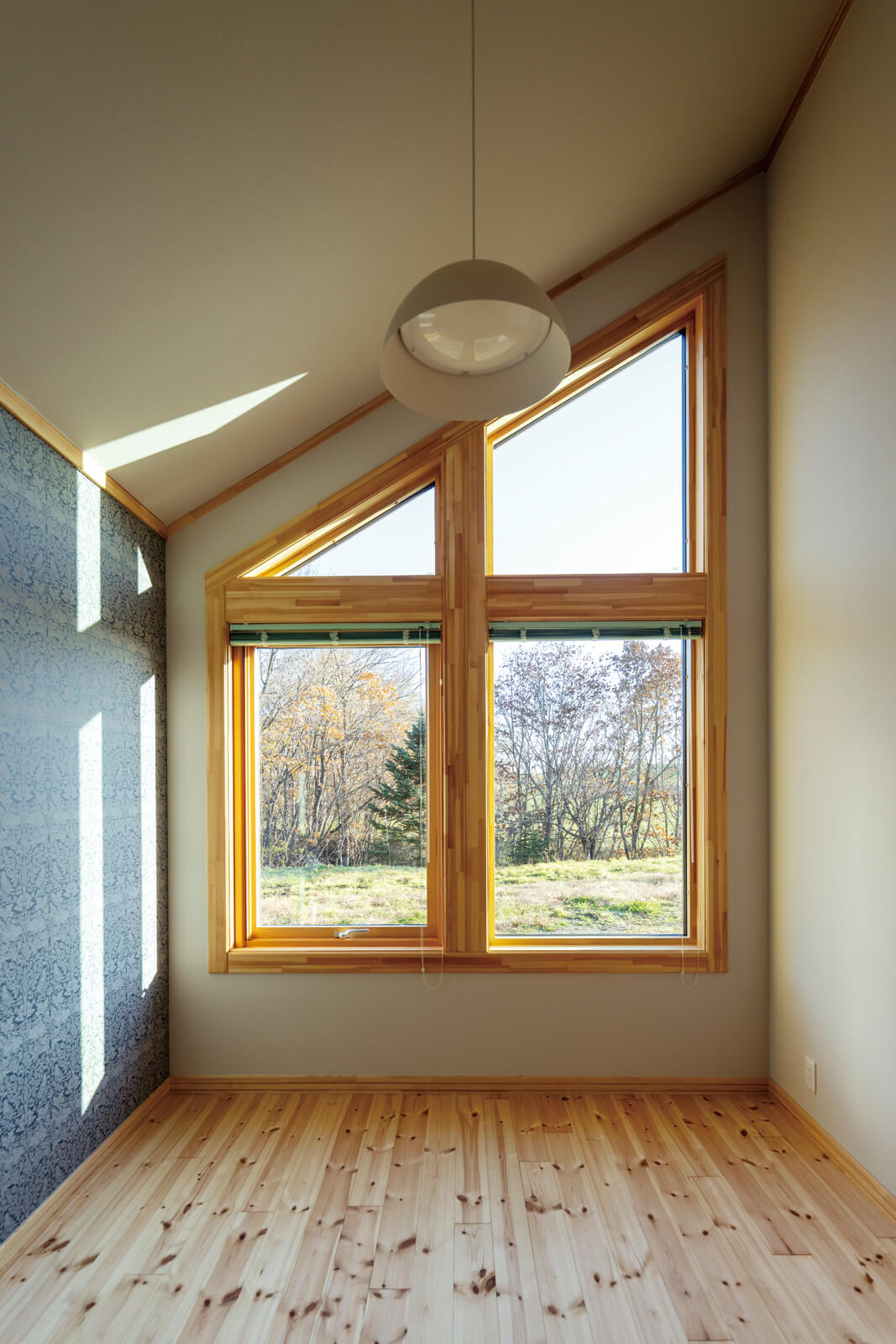 三角屋根が農村に溶け込む、大開口の眺望とパイン材に包まれた平屋
