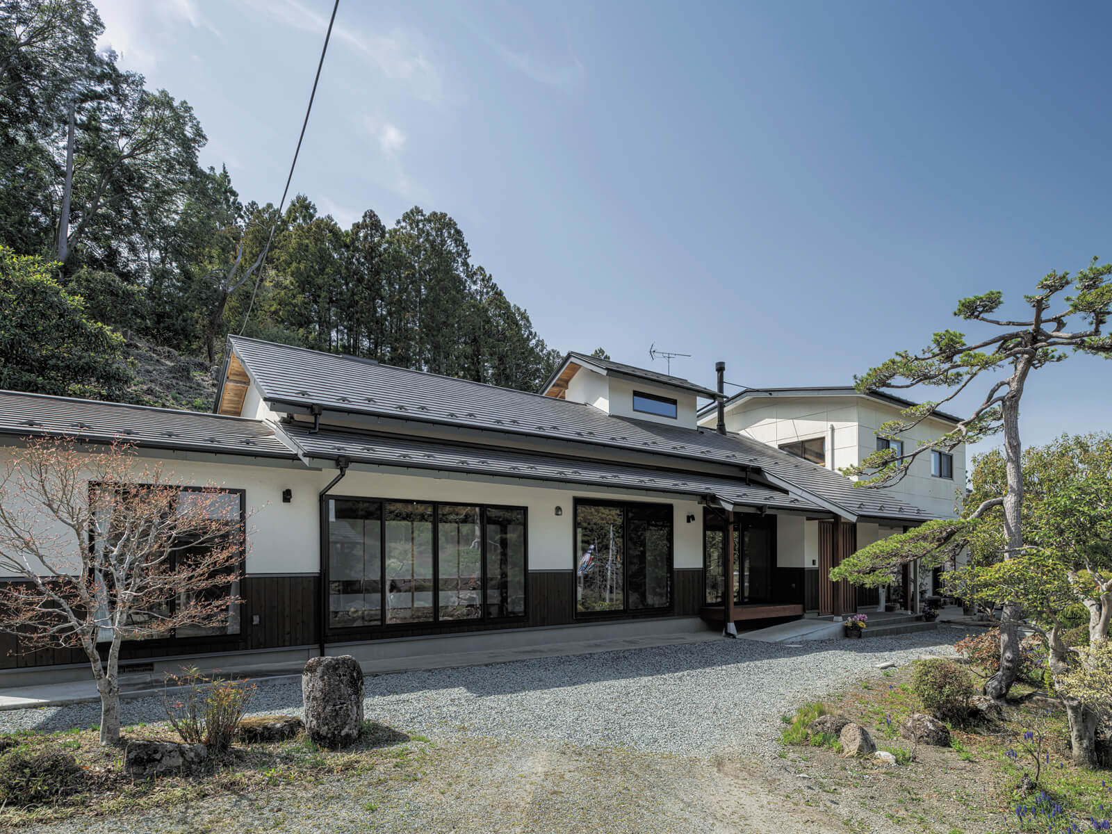 三角屋根が農村に溶け込む、大開口の眺望とパイン材に包まれた平屋