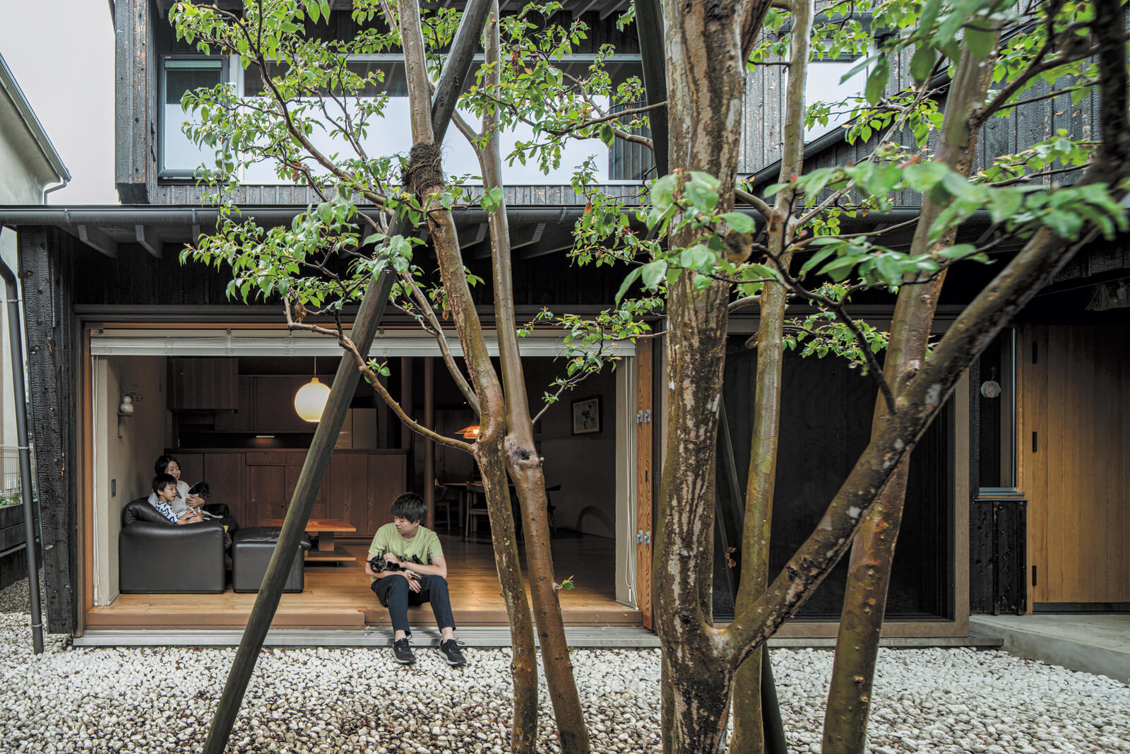 両親から受け継いだ住まいの寒さや結露に悩んでいたご一家が選んだのは、自然の力を引き出す建築家の設計で、一年中快適に過ごせる理想の住まいでした。焼スギや土壁、土間といった自然素材が、関東特有の湿気や温度を自然に整えてくれます。さらに、吹き抜けとリビングの大開口による巧みな光と風のコントロールが、心地よい開放感を創出。時を重ねて美しく経年変化した家で育つお子さんたちも、本物の素材を慈しんでいるそう。確かな性能と本物の自然素材が、ご家族の心身を健やかに支え続けています。