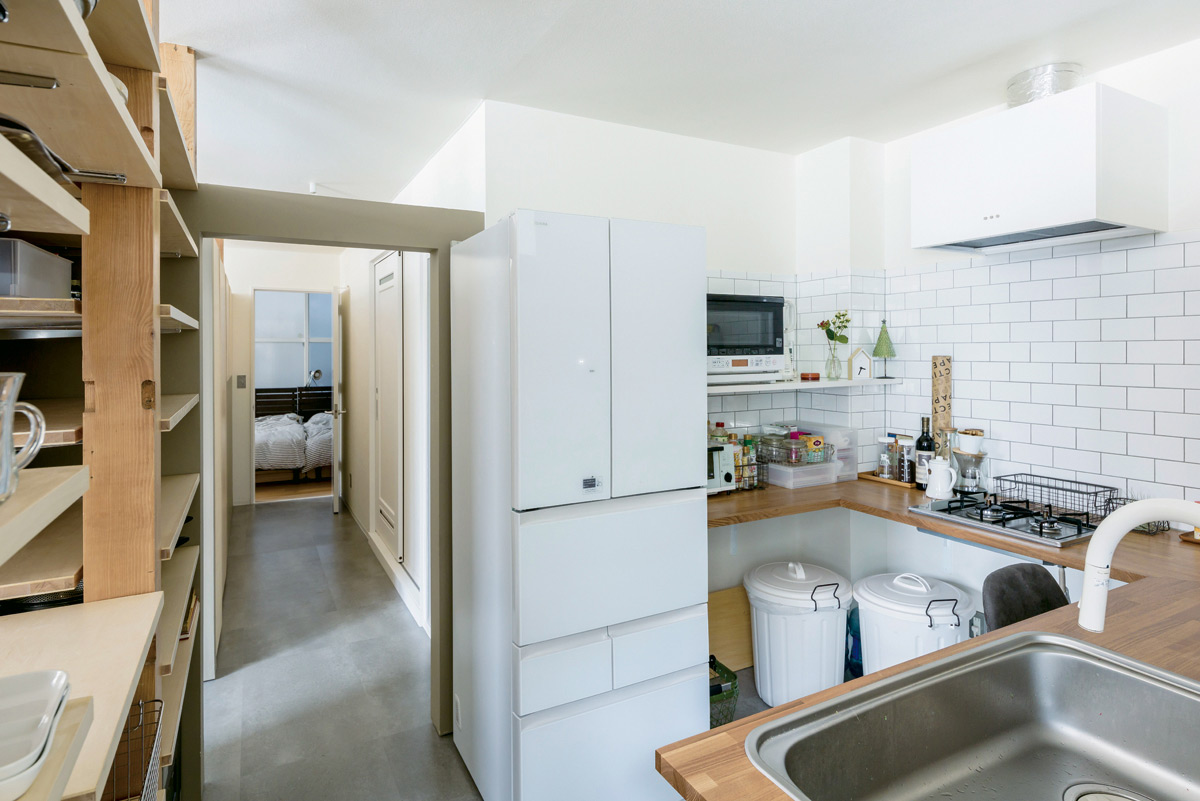 美容師のSさんが独立を機に購入したのは、立地を優先的に考えて選んだ店舗付きの住宅。購入当初に最低限のリフォームを施して住みはじめたものの、「細かな間取りの狭小住宅は動線が悪く、冬に水が凍るくらい寒かった」ことから、暮らす部分を大幅にリノベーションすることに。限られた空間と設備を最大限に生かすため、スケルトン状態にしてから各生活空間をゾーン分けし、回遊できる動線としたワンルーム型プランに。さらに冷気が入る開口は塞ぐなどして断熱にも配慮しました。リノベーションによって、風通しも良く冬も快適に過ごせるようになった職住一体の住まいです。